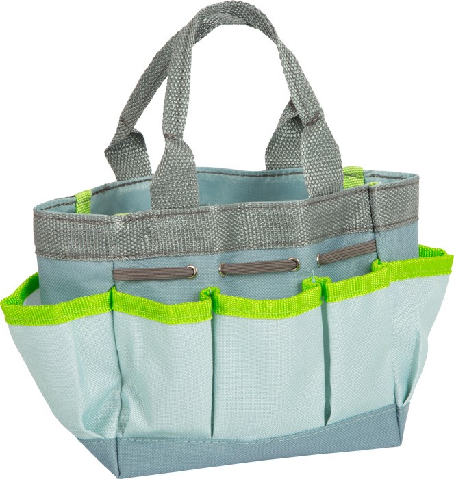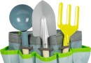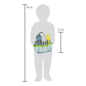 Tato praktická zahradní taška je vhodným pomocníkem na zahradě a je ideální pro snadnou přepravu veškerého zahradního nářadí. Šest různě tvarovaných nástrojů z robustního kovu v módních barvách s rukojetí z přírodního dřeva láká k zahradním aktivitám! Lopatku na smetí, lopatku na uhlí, ruční rýč a naběračku, stejně jako malé hrábě a vidle, lze snadno uložit do tašky a mít je tak vždy po ruce. Tato zahradnická sada se skvěle doplňuje s lahví rozprašovače, která funguje i jako zalévací konev. Speciálně vyrobeno pro velikost a potřeby malých začínajících zahradníků, ale ideálně se hodí i na pláž a pískoviště! Zahradní taška pro děti nabízí dostatek místa pro veškeré nářadí díky četným bočním kapsám s upevňovacími gumičkami na nářadí – kopání, sázení a sklízení může být zábavné! Hlavní vlastnosti: svěží, módní barevnost6 kusů nářadí a konvička-rozprašovačpraktická, přenosná taškasvou velikostí přizpůsobeno potřebám dětípodporuje vztah k přírodě