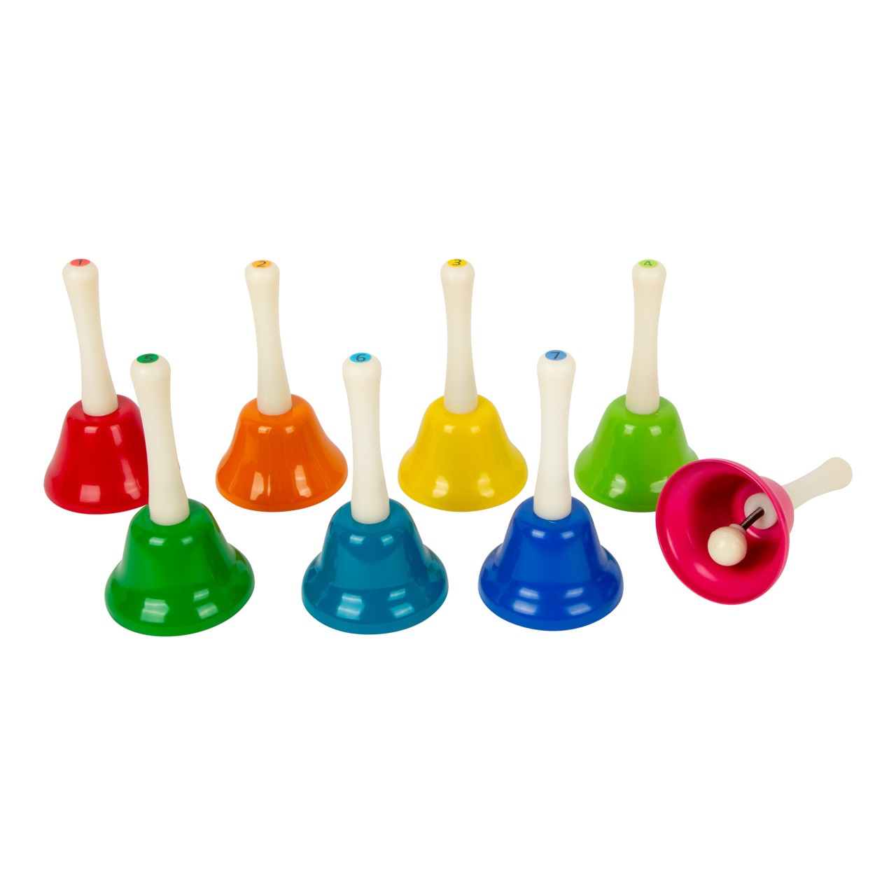 Toto je něco pro vaše uši! Těchto osm zvonečků nerozlišuje jen barva, ale také zvuk. Každý z nich je naladěn na jinou notu – C, D, E, F, G, A, H, C. V balení naleznete také noty s různými skladbami pro začátečníky a malé děti – noty jsou zaznačeny i barevně. Hudební set podporuje u dětí rozvoj rytmu, hudebního sluchu a také koordinace ruka-oko. V notách najdete písničky jako „Strýček Donald farmu měl“, „Rolničky“, „Třpyť se, hvězdičko“. Perfektní také do školek, prvních stupňů základních škol. Hlavní vlastnosti: jasné, výrazné barvy8 zvonků