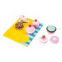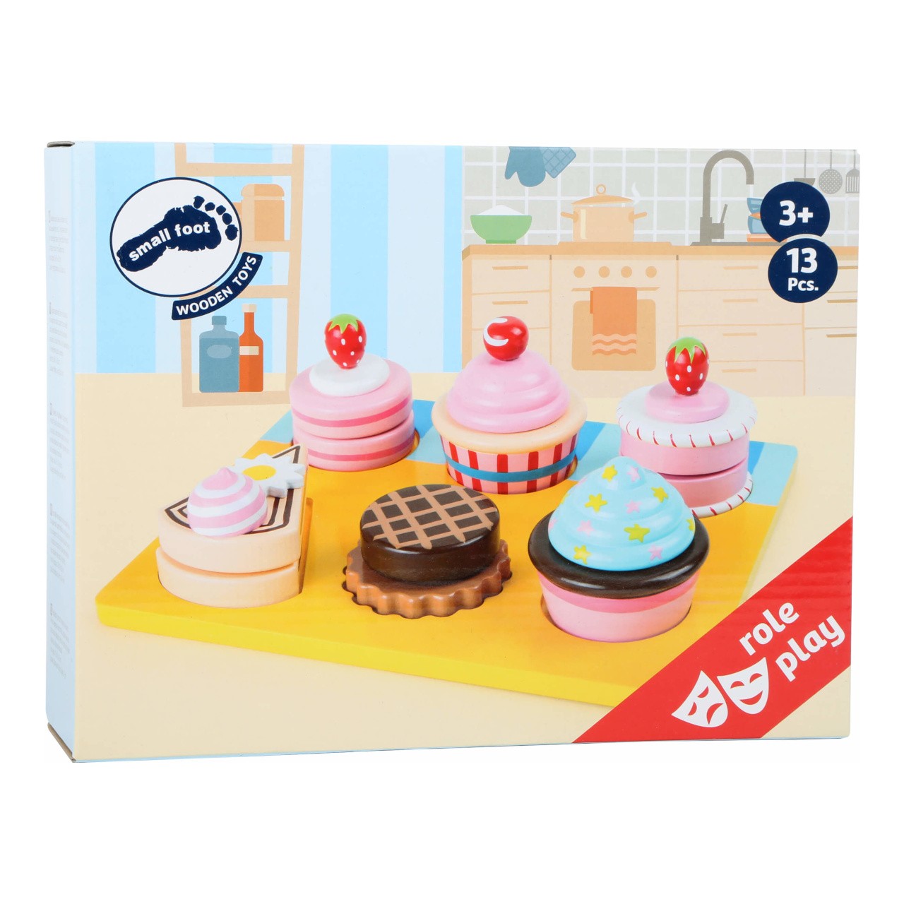Nebraňte se a nabídněte si, s těmito sladkostmi neztloustnete! Souprava maket rozmanitých zákusků pro všechny mlsné jazýčky. Jejich pomocí lze zpestřit hry na hostitele podávající občerstvení váženým návštěvám, nebo na prodavačky a prodavače, různé stánky a obchody. Prostřednictvím těchto her si mohou děti osvojit způsobné společenské chování či pravidla servisu, a rozvíjet tak cenné komunikační dovednosti. Každý zákusek je sestaven ze dvou dílů spojených suchým zipem, které lze mezi sebou kombinovat. Děti tak mohou dát volný průchod své fantazii i při přípravě. Všechny součásti jsou vyrobeny z odolného dřeva a dekorovány pestrými nezávadnými barvami. Hlavní vlastnosti: 13 dílů celkem; podnos a 6 zákusků2 dílné zákusky možno vzájemně kombinovatrobustní a odolné dřevěné provedení