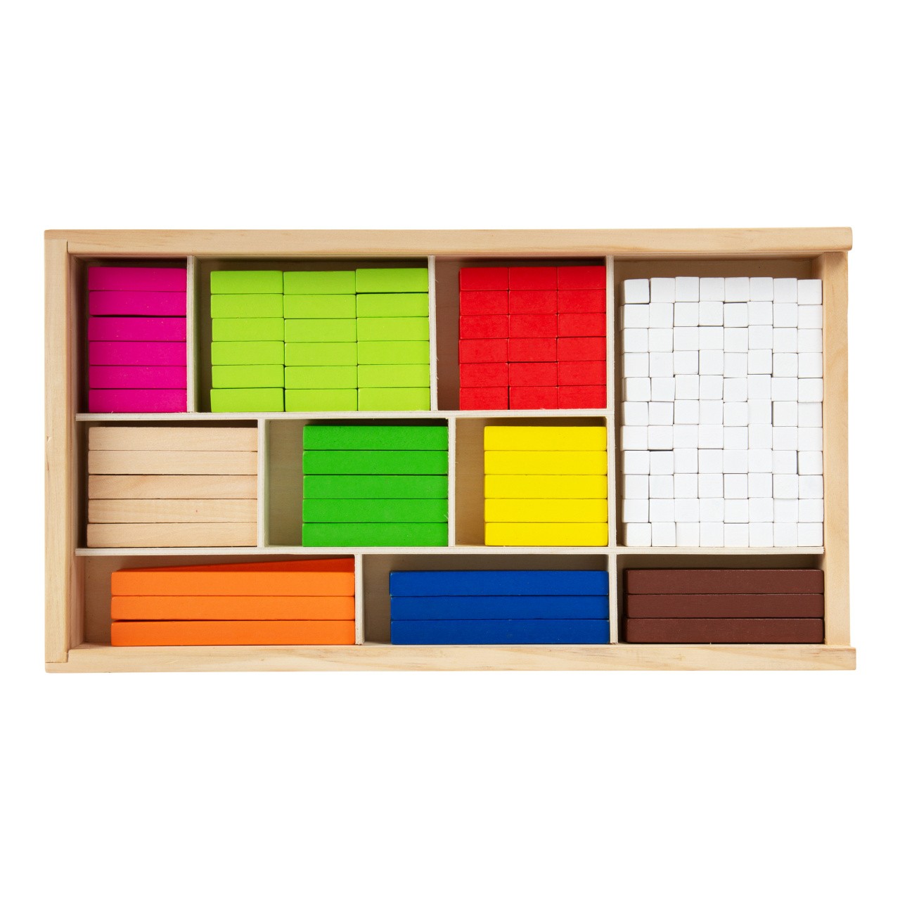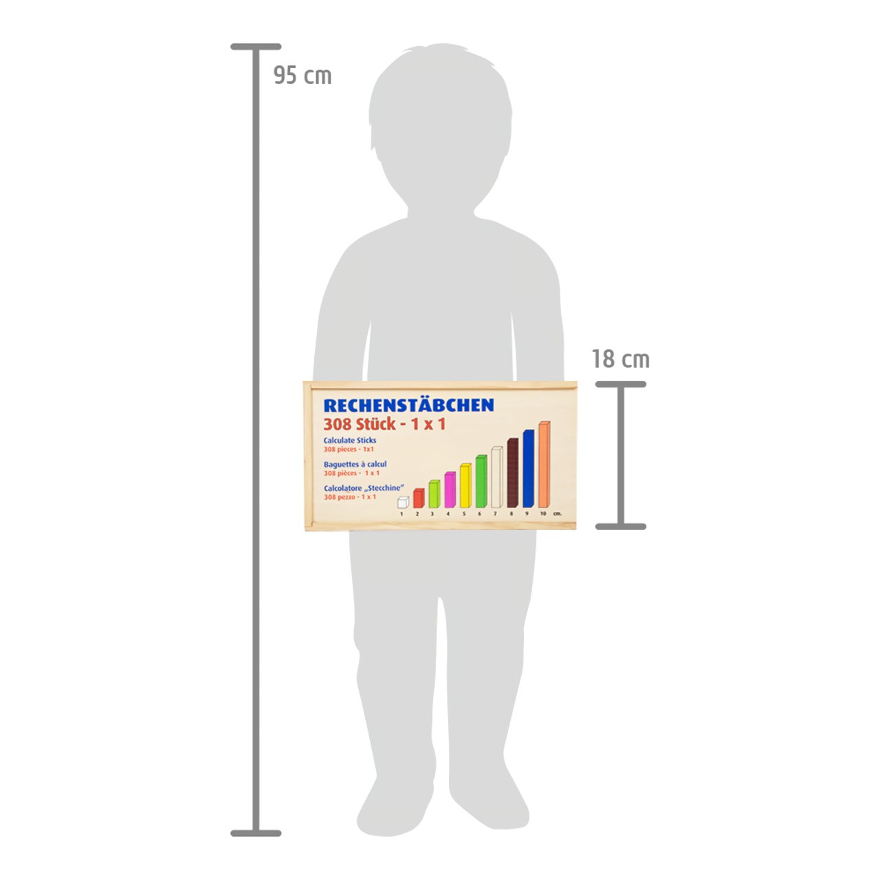 Je deset větší než tři? Tyto všestranné matematické tyčinky poskytnou dětem první porozumění číslům a rychle a názorně je podpoří při prvních pokusech o matematické rovnice. Různé délky tyčinek slouží jako orientační pomůcka. Děti předškolního věku získají základní matematické dovednosti při počítání, porovnávání a třídění tyčinek. Tyto tyčinky jsou ideální společníci pro matematické profesionály všech věkových kategorií. Trénují představivost a logické myšlení a zároveň předávají pochopení velikostí a barev. Všechny tyčinky lze po ukončení učení roztřídit a uložit do přiložené dřevěné krabice s posuvným víkem. Hlavní vlastnosti: 308 ks víceúčelových matematických tyčinek jako ideální úvod do světa číselpočítání, porovnávání a třídění přináší dítěti první základní matematické dovednostibaleno v dřevěné krabici s posuvným víkem