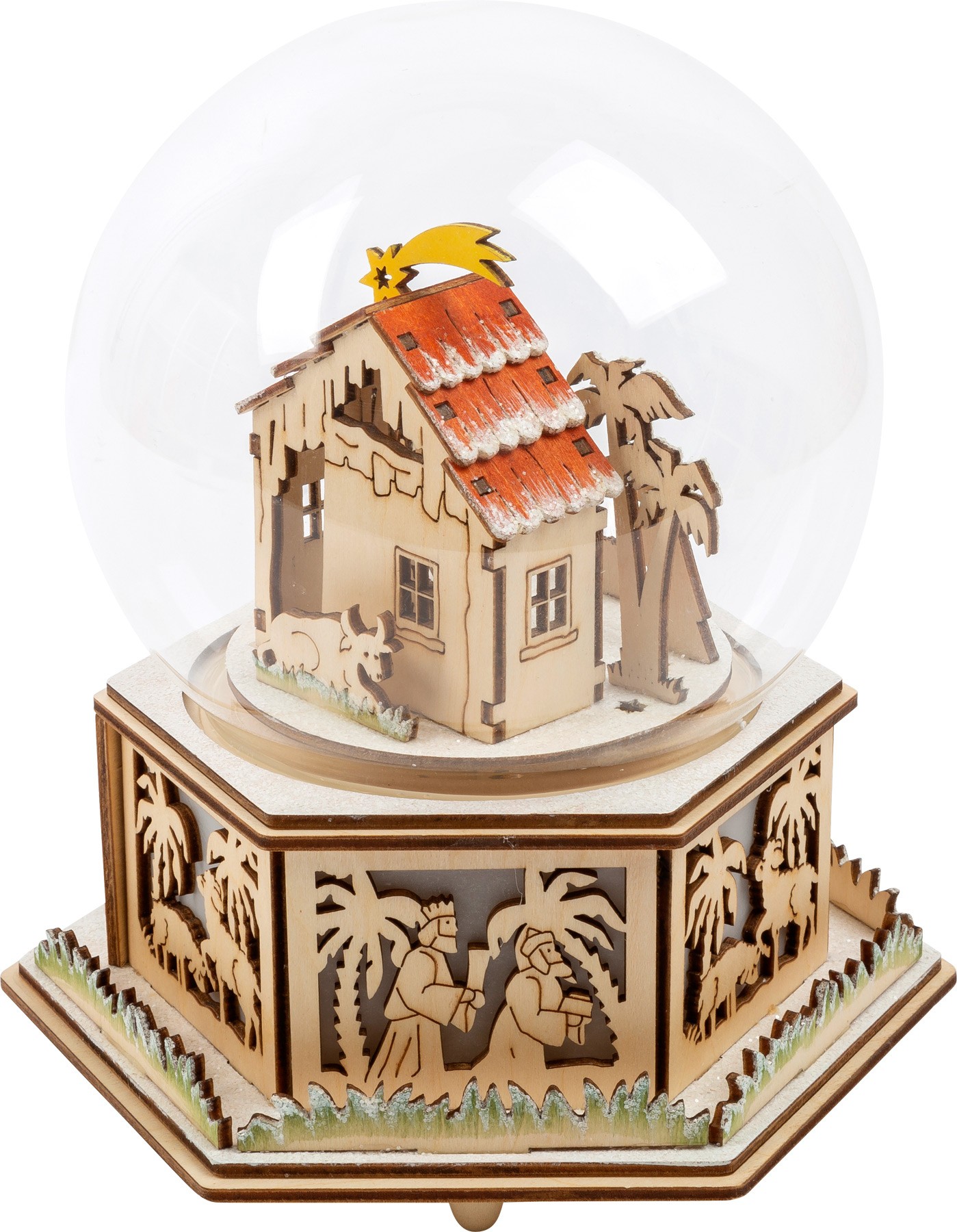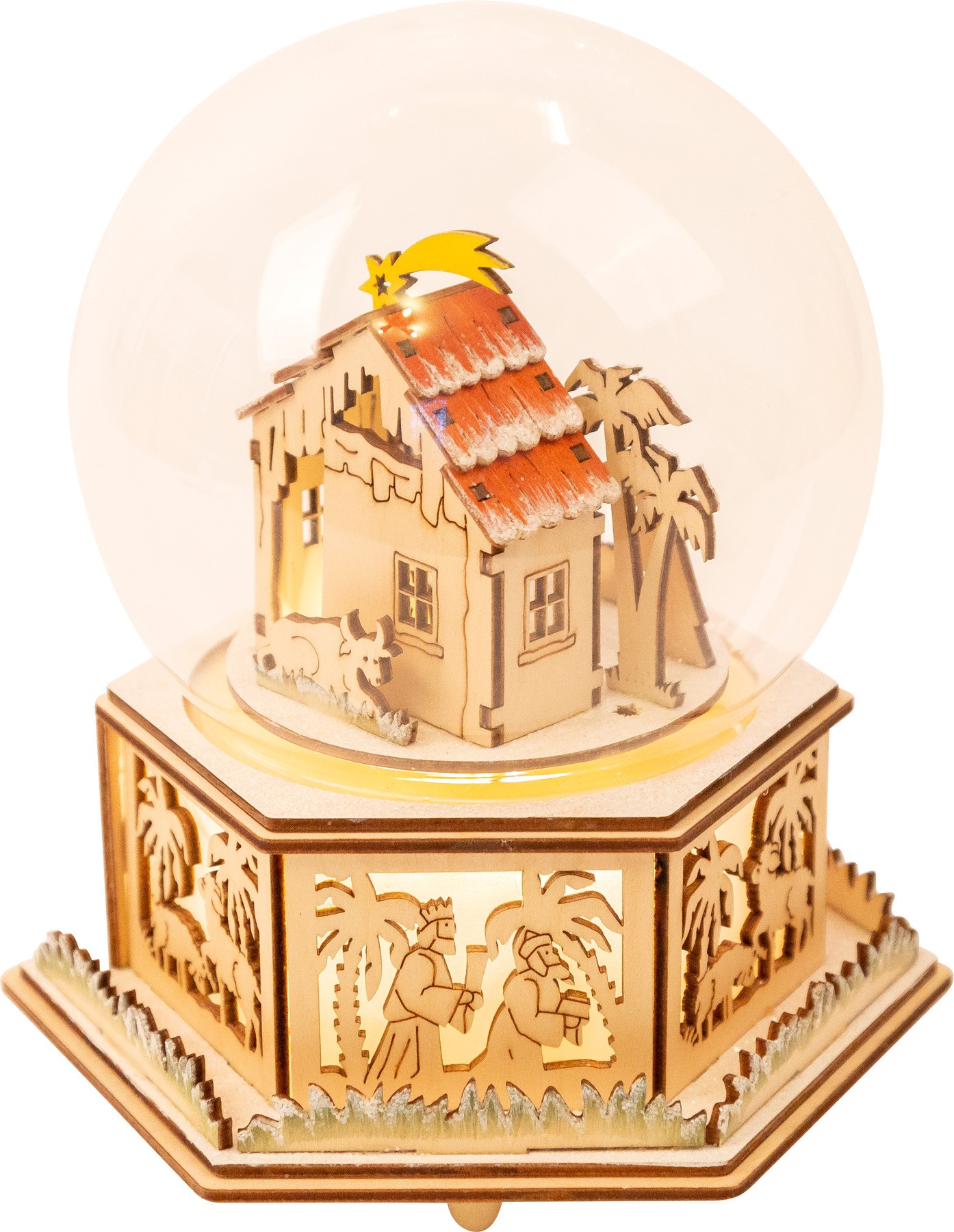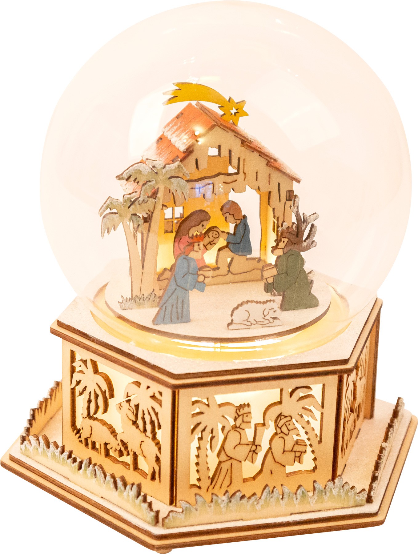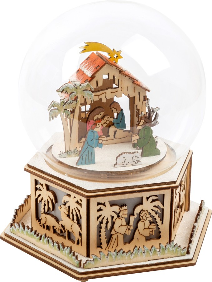 Tato krásná světelná dekorace je vyrobena z kvalitního dřeva. Hudební skříňka s vánočním motivem betlému hraje melodii "Tichá noc". Zatímco hraje hudba, rozsvícená sváteční koule vydává tlumené světlo. Baterie nejsou součástí balení. Hlavní vlastnosti: sváteční koule a hrací skříňka v jednom přidá Vánocům příjemnou atmosférudrobné,jemně vyřezávané detailyodpovídá evropské bezbečnostní normě