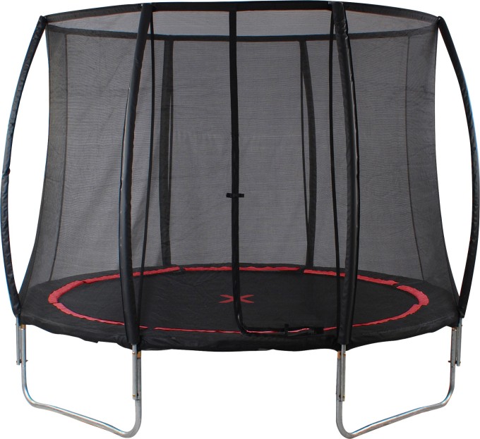 Černá trampolína se sítí, s červeným označením, které odděluje část ke skákání od ochranných prvků. Sférický design konstrukce tyčí zajišťuje bezpečnost při skákání, tyče se totiž nedotýkají ochranné sítě. Navíc jsou tyče polstrované, což znamená ochranu navíc. Skvělý doplněk do každé zahrady či na hřiště. Nosnost do 120 kg umožní zábavu nejen dětem, ale i dospělým. Pouze pro soukromé použití!