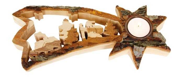 Tento stojan je vyroben z masivního kusu dřeva a zdoben jemně vyříznutým motivem. Vyzařuje jemné světlo.