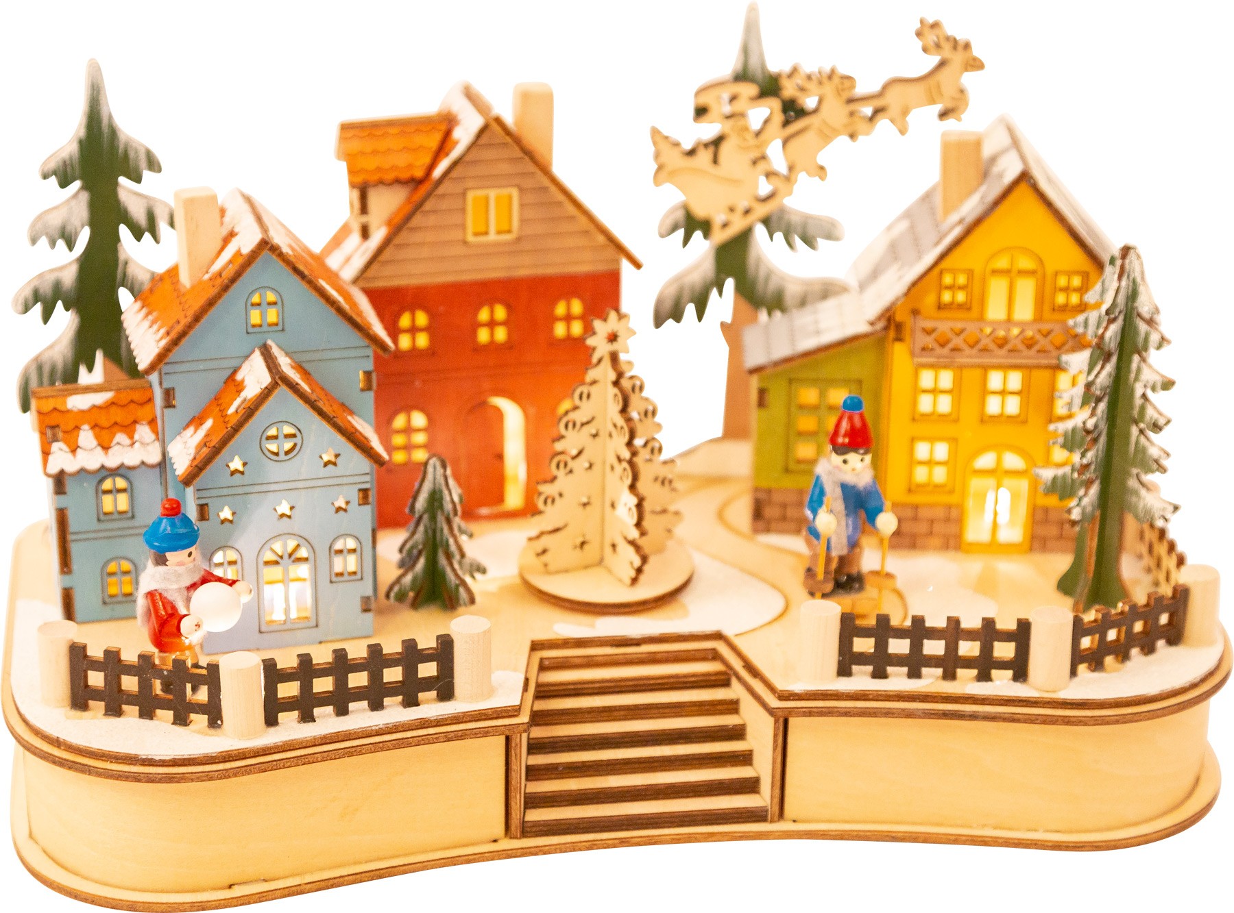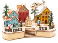S touto bohatě zdobenou vánoční vesnicí se vánoční duch jistě nastěhuje i k vám domů. Barevné domky jsou vyrobeny z jemně vyřezávaného dřeva poskytující nepřímé osvětlení. A je tady ještě jedna skvělá věc: Vánoční stromeček uprostřed vesnice se po zapnutí lampy otáčí a pokud se podíváte pozorně, můžete dokonce spatřit Santu Clause a jeho sáně. Baterie nejsou součástí balení. Hlavní vlastnosti: dekorativní vánoční lampa jistě obohatí předvánoční časpropracované detaily