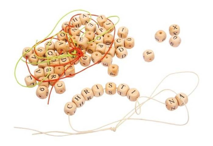 Poškozený obal. Nové zboží bez závad. Zhruba 300 dřevěných kostek potištěných písmenky, včetně 4 stuh k navlékání. Lze tvořit řetízky s jmény nebo jen na stole skládat slova. Hravým způsobem naučí poznat písmena a vybídne k prvním „pokusům psát“.