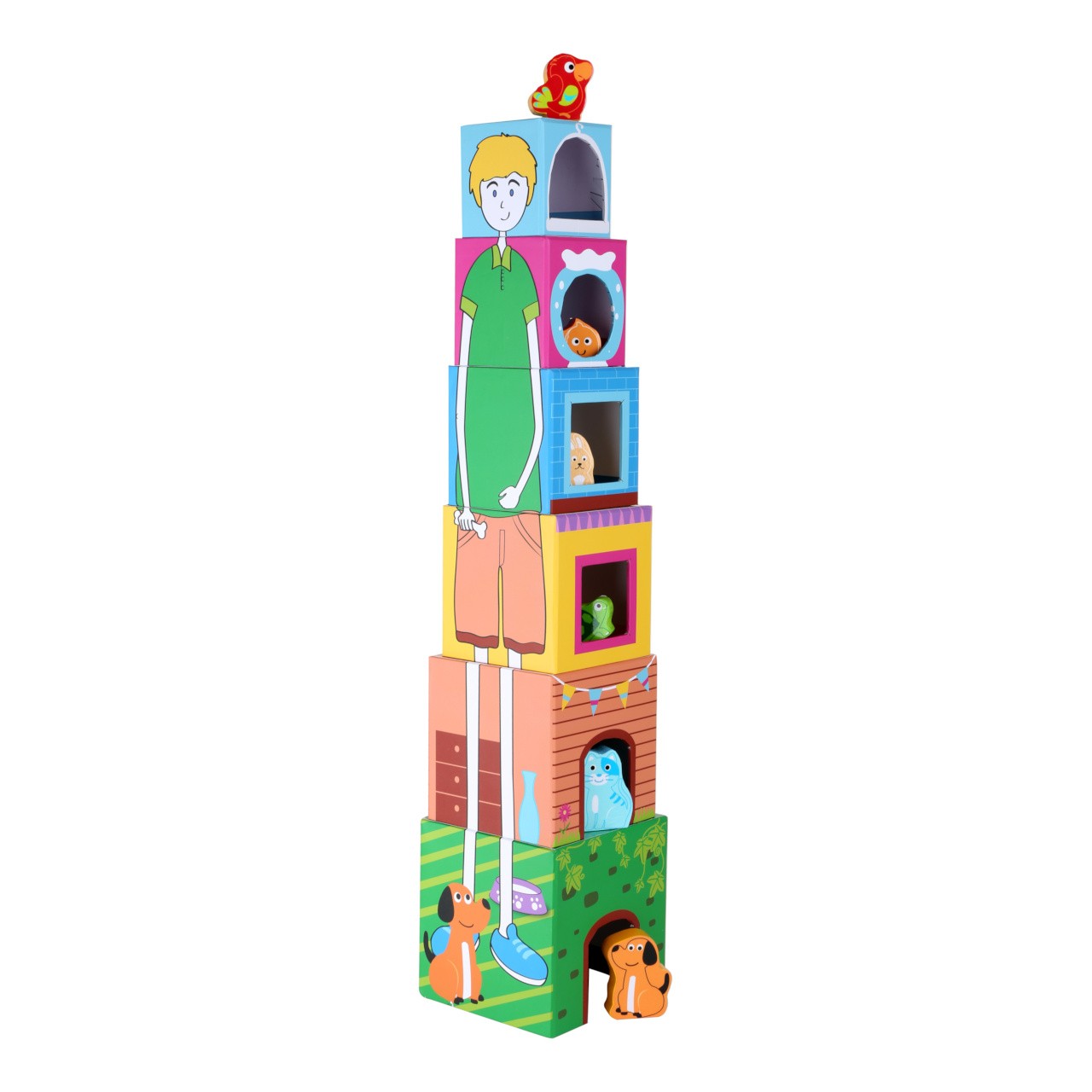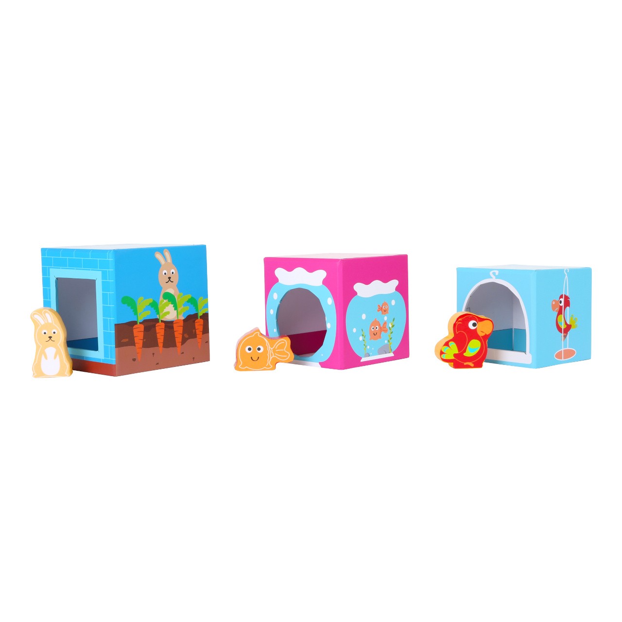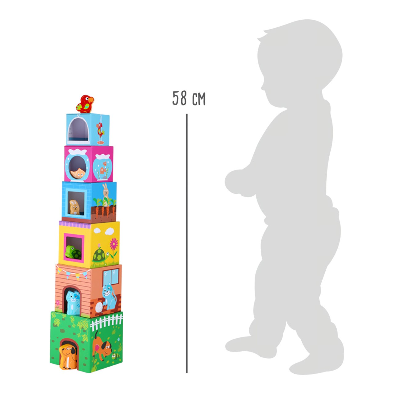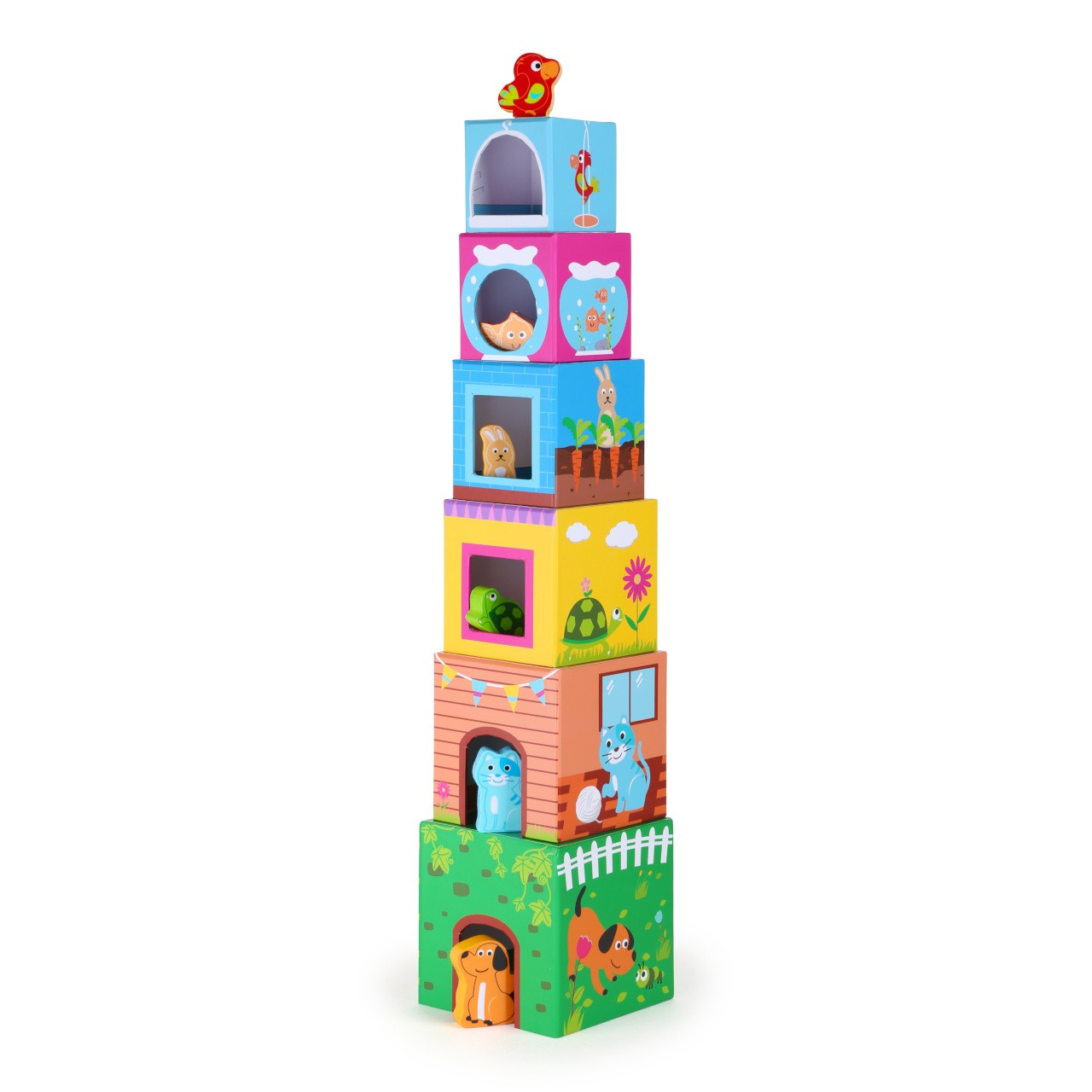 Kostky jsou vyrobeny z kartónu, zvířátka ze dřeva. Kostky rozdílných velikostí, zkuste naskládat na sebe ve správném pořadí od největší po nejmenší a vytvořte věž. Všechny skládací kostky mají otvor, ve kterém najde svůj domov šest různých dřevěných zvířat. Každý mazlíček musí mít své správné místo na spaní. Hlavní vlastnosti: rozvíjí koordinaci ruka-oko krásná ilustracerozvíjí jemnou motoriku a zručnostodpovídá evropské bezpečnostní normě
