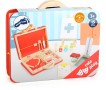 Trendy lékařská souprava v kufříku pro mladé doktory a doktorky. Všechny předstírané lékařské úkony u lékaře, nebo na pohotovosti, zvládnou děti v dětském pokojíčku s tímto dřevěným lékařským kufříkem.Početné náčiní splní přání každého mladého lékaře. Injekční stříkačky a nádobky na masti jsou dokonce vybaveny funkcí pumpy. Takto si mohou všechny panenky a medvídci nechat změřit krevní tlak a ošetřit drobné ranky. Všechna ošetření lze nakonec zapsat do praktické lékařské dokumentace. Komplexní vybavení včetně tlakoměru, lékařské dokumentace, stetoskopu, pinzety, teploměru, stříkačky, nůžek, dávkovače dezinfekčního roztoku s pumpičkou. Obsahuje také tubu na mast, nádobky na tablety a blistrové balení tablet. Hračka dětem pomůže s rozvojem sociálních dovedností a vypravěčství. Další, prosím! Hlavní vlastnosti: lékařská souprava se spoustou dřevěného lékařského vybavenípružné elastické pásky a oddělené přihrádky udrží léky a lékařské vybavení na místě klasické doktorské symboly a kresby, které jsou pro děti snadno srozumitelnépodporuje aktivní hraní a rozvíjí sociální dovednosti