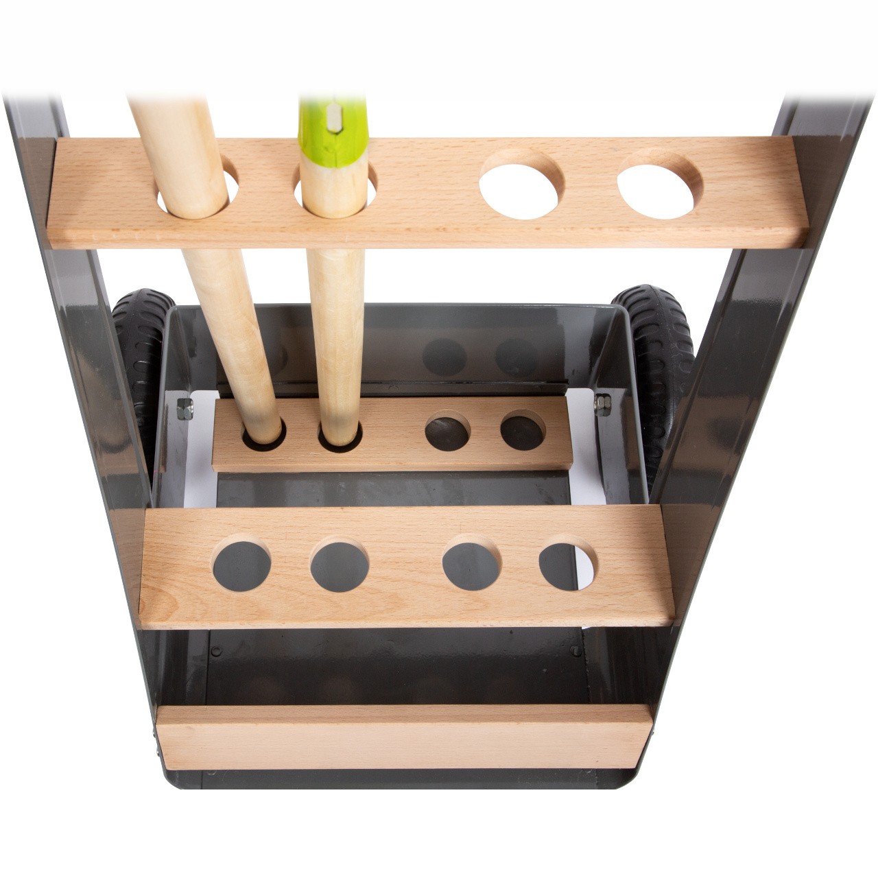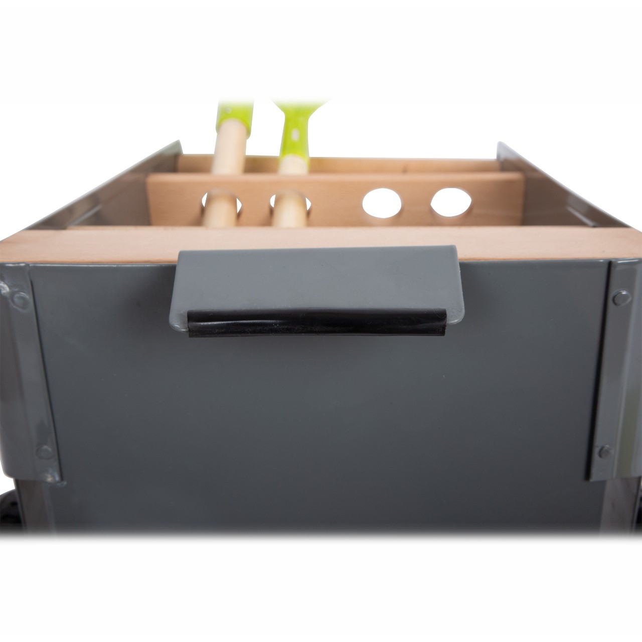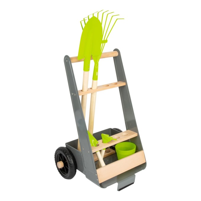 Mladí nadšení zahradníci a zahradnice teď mohou začít pracovat na svém vysněném záhonku. Stabilní vozík vyrobený z bukového dřeva a kovu lze jednoduše tlačit či tahat po zahradě, má k tomu totiž stavěná kola. Dobře promyšlený design myslel na úložný prostor, vzhled i bezpečnost. Hrábě, rýč i lopata mohou být uloženy tak, aby směřovaly pryč od hlavy dítěte. Hlavní vlastnosti: atraktivní a robustní mix materiálů – buku a kovulehký přesun díky pevným a velkým kolůmosm otvorů pro uložení zahradního náčiníjednoduše omyvatelnýkovové nožičky opatřeny gumou pro lepší stabilituk doplňkům vozíku patří rýč, hrábě, plastový květináč, lopatka a hrabky