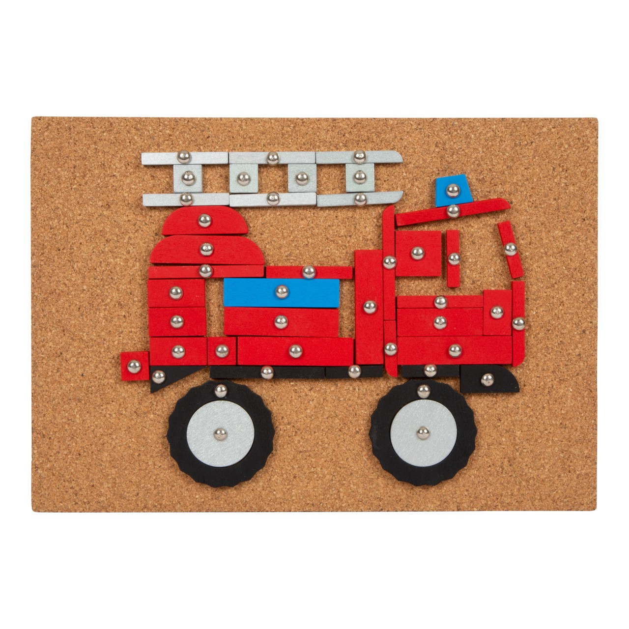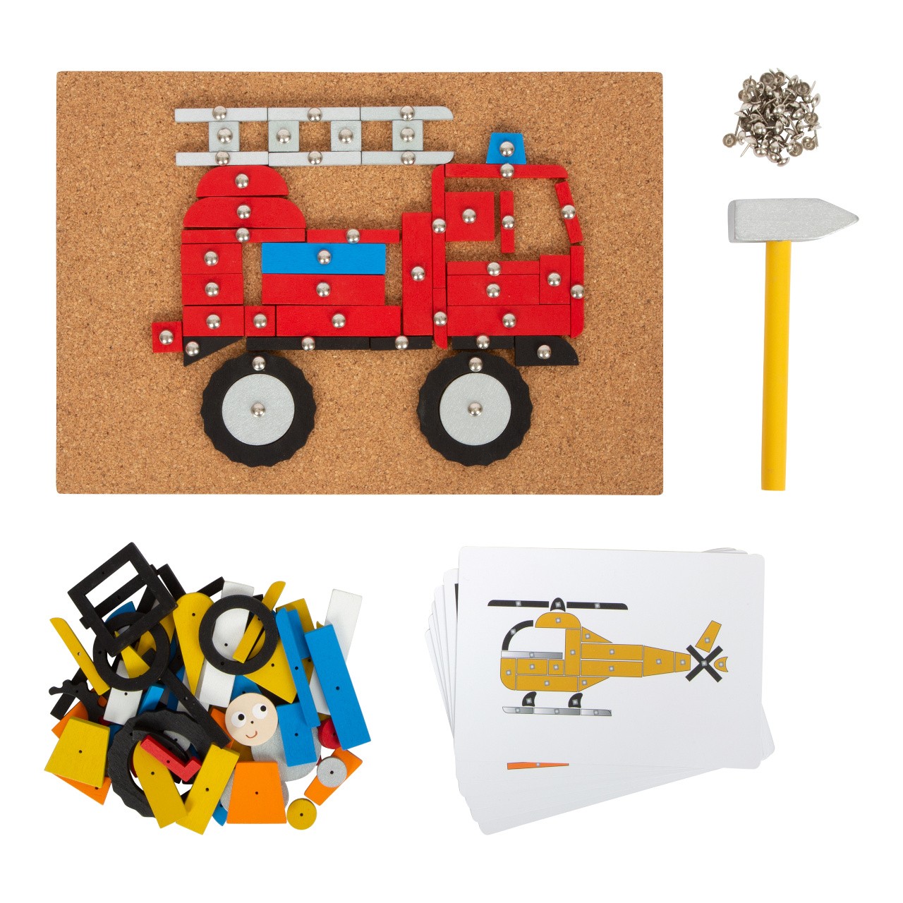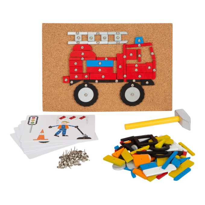 Obsáhlá kreativní hrací sada s tematikou dopravy! V balení najdete korkovou podložku, dřevěné kladivo, připínáčky a mnoho dílků z laminovaného dřeva v rozdílných tvarech a barvách. V krabici, která je vhodná i na uschování této hračky, najdete šest obrázkových předloh.Klasická zatloukací hra v moderních barvách a nesmrtelném designu, s kterou si děti mohou vytvořit obrázky dopravních prostředků, stavebních strojů, aj. Mohou se řídit obrázkovými předlohami nebo tvořit dle vlastní představivosti. Hračka pomáhá s rozvojem kreativity, trénuje zručnost, zlepšuje koordinaci ruka-oko a rozeznávání barev a tvarů. Zatloukací sada je vhodná pro děti malé i větší. Hlavní vlastnosti: zatloukací hra s rozsáhlým výběrem motivůdřevěné kladívko, připínáčky, korková podložkadílky různých tvarů a barevděti si procvičí motoriku a rozeznávání tvarů a barevmoderní barevné schémazlepšuje zručnost a koordinaci ruka-oko