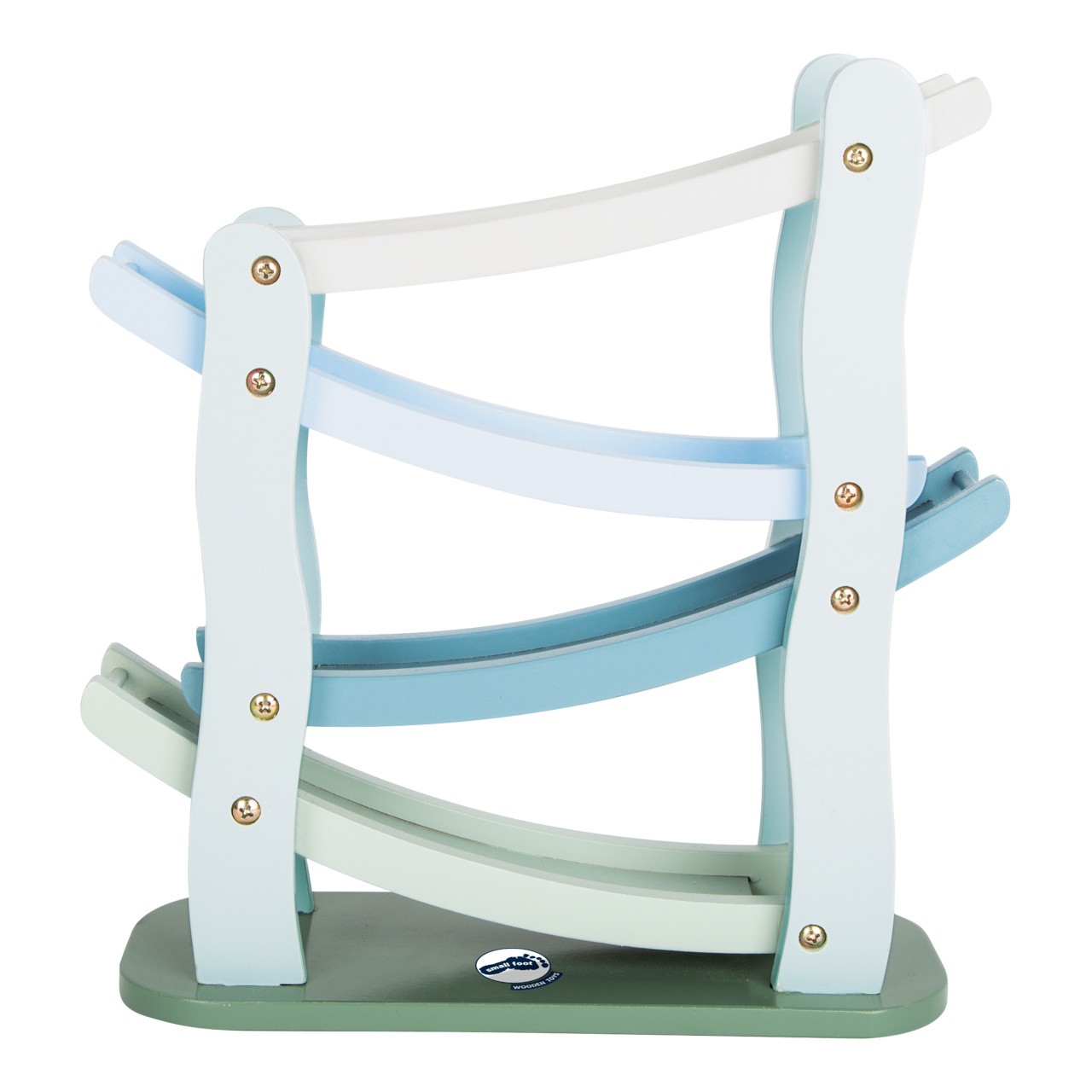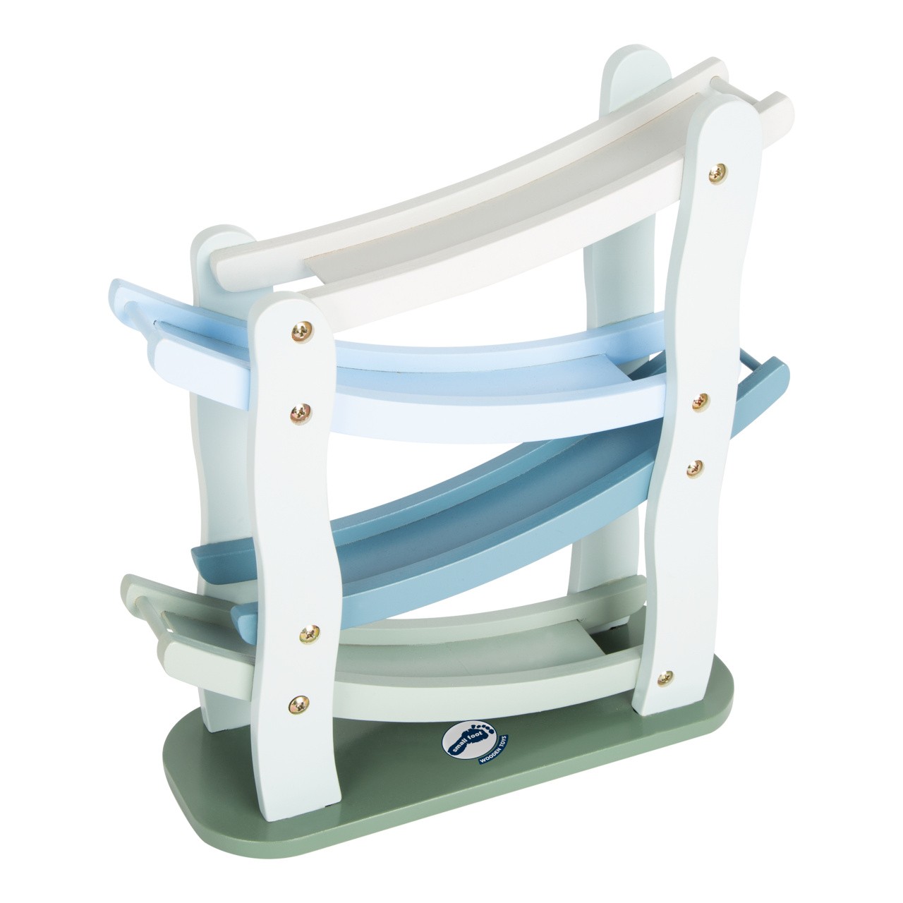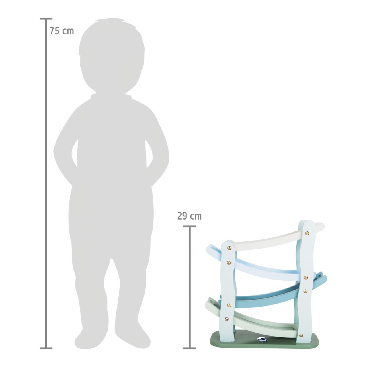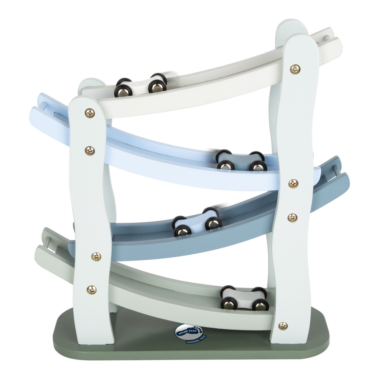 Na značky, připravit, start! Tato dřevěná kaskádová závodní dráha nabízí prostor pro změření rychlosti 4 autíček. Z jednoho patra na druhé, autíčka dělají přemety a jen koukat na ně je zábavné. Dráha je vyrobena z přírodního a bílého dřeva, jedno autíčko je přírodní, zbylé 3 jsou barevné. Hračka rozvíjí motoriku dětí, také koordinaci ruka-oko. Hlavní vlastnosti Klasický design v modrošedé barvěOboustranná autíčka s pogumovanými kolyRozvíjí motoriku a koordinaci ruka-oko