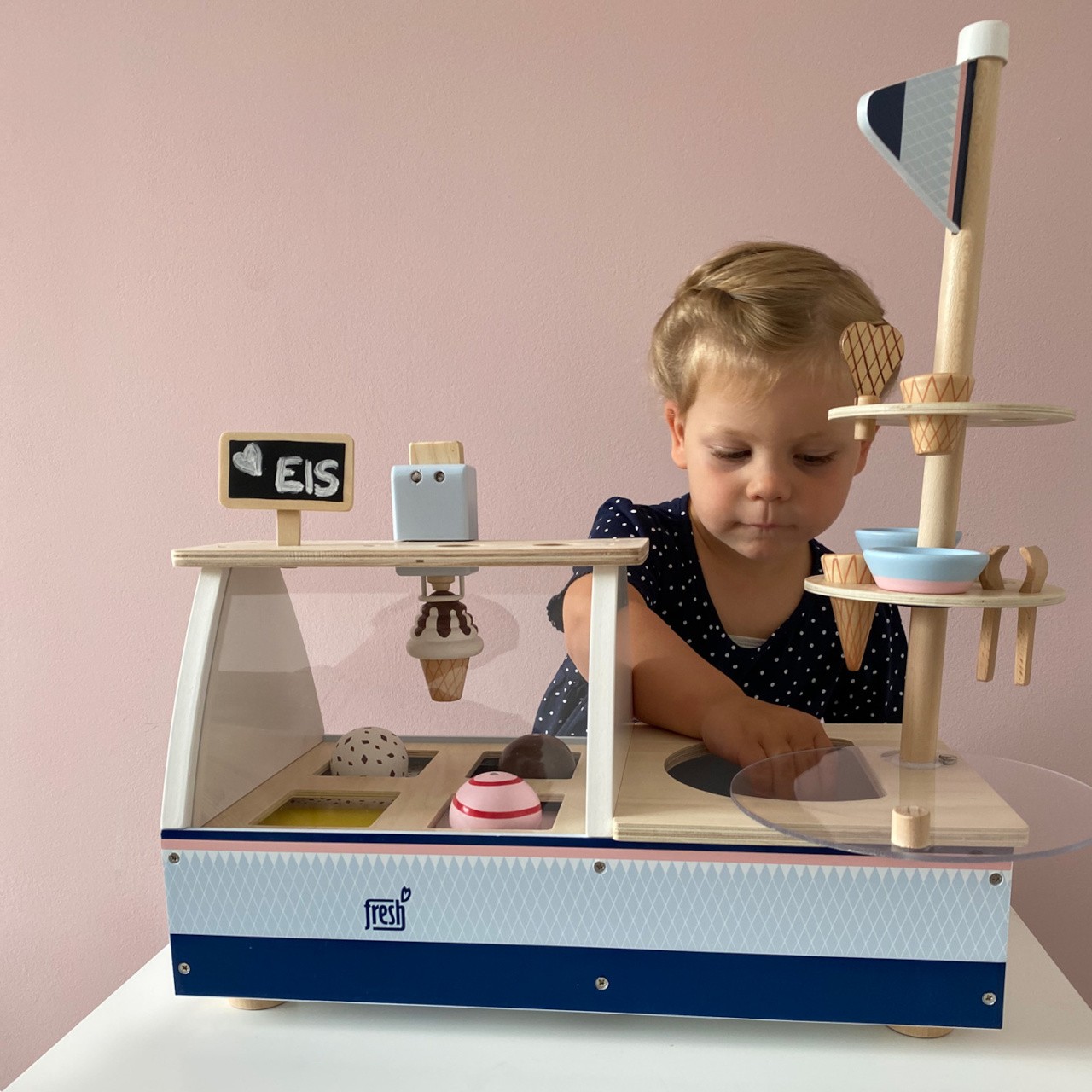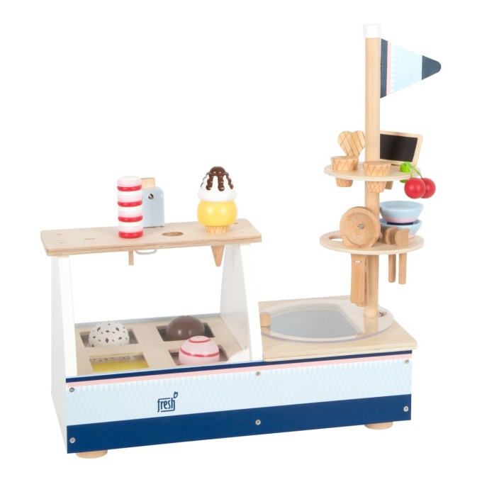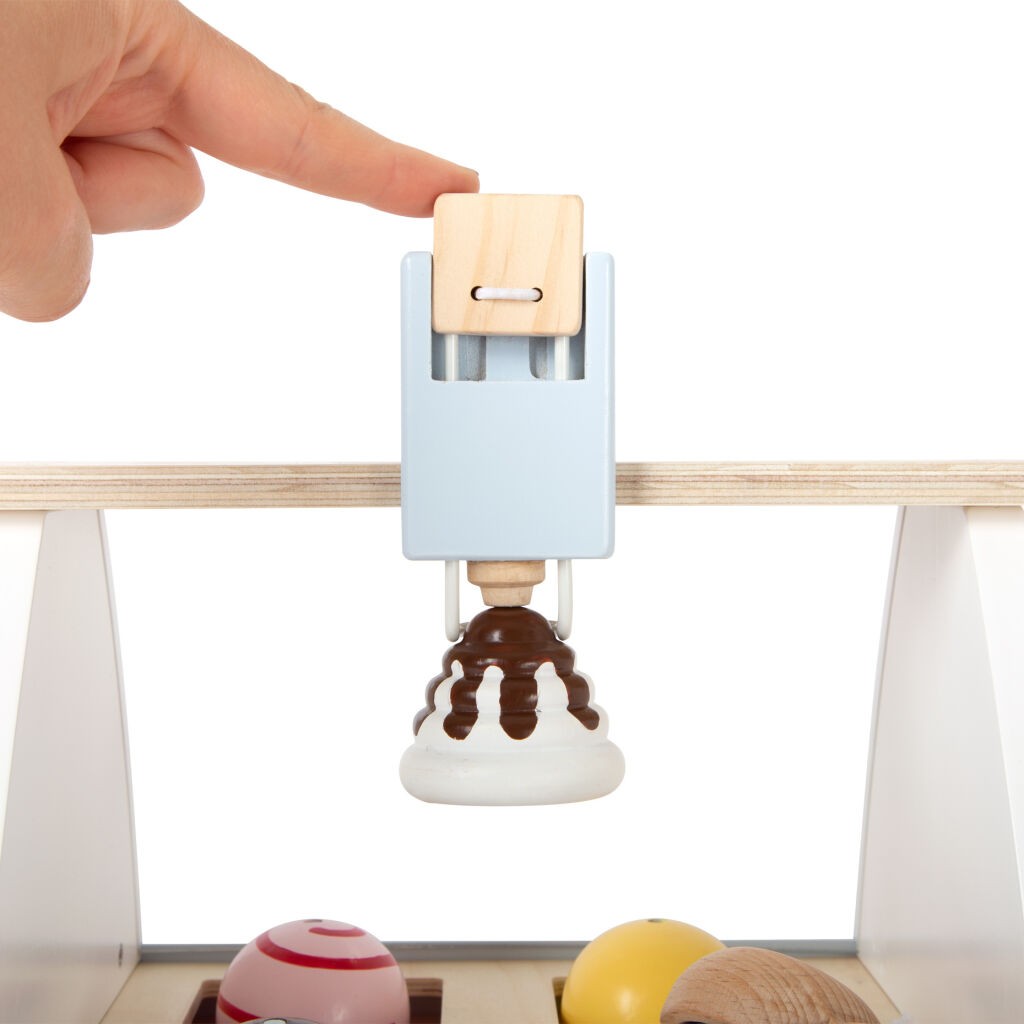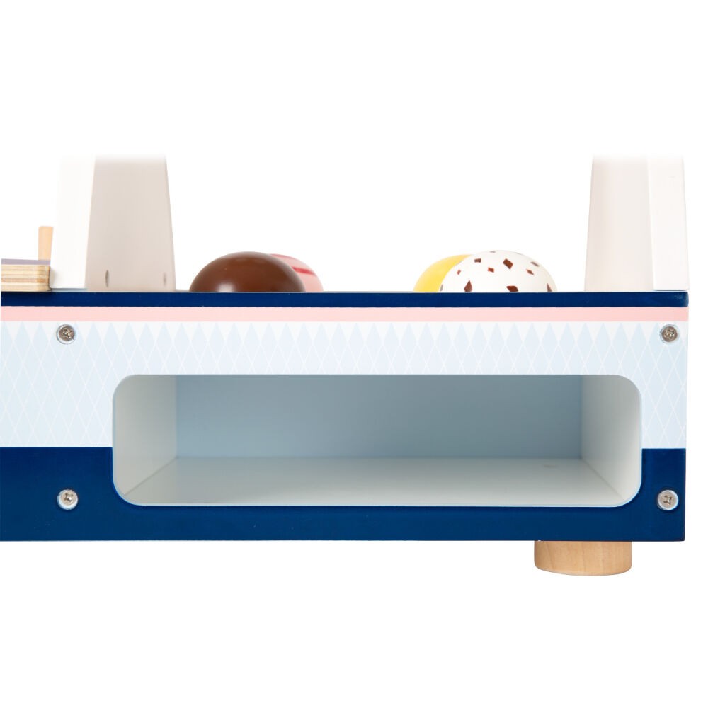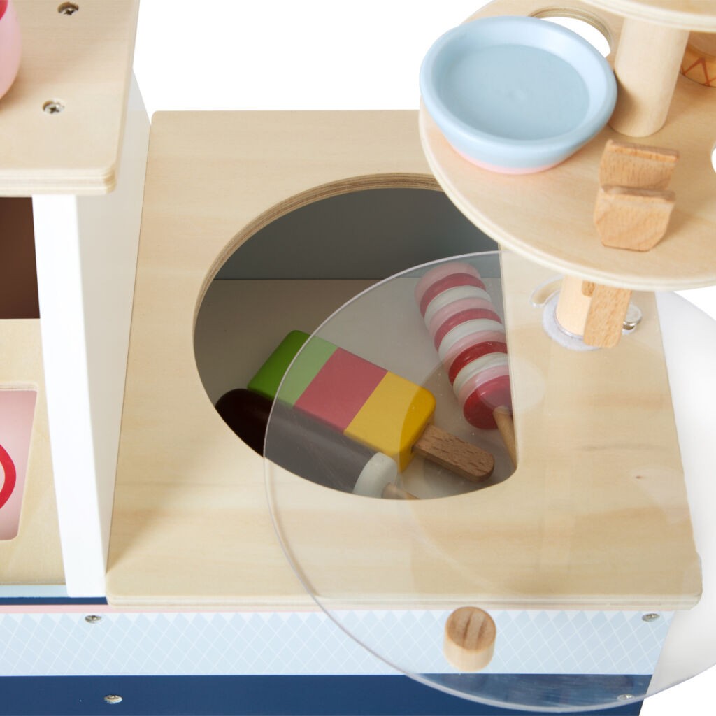 Jdeme na zmrzlinu! Tento dřevěný zmrzlinový set je perfektní na léto i zimu. Zmrzlinový stánek je modro-růžový, má také prvky přírodního dřeva, zákazníky nadchne velkým výběrem dezertů a svými funkcemi a příslušenstvím. Můžete si dát více kopečků zmrzliny, nanuk, točenou zmrzlinu, poháry, wafle... a to vše ozdobit třešničkou. Stánek má také plastovou vitrínu, mrazničku s plastovým poklopem, stojan na kornouty. Kopečky zmrzliny a točená zmrzlina jsou magnetické, v balení také najdete tabulku, na kterou můžete psát křídou. Zmrzlinu (vanilku, čokoládu, stracciatellu a jahodu) můžete z vitríny vyndat a dát ji do misky nebo kornoutu. Všechny se také vejdou na wafli. Vytvořte si dezert dle svého gusta. Zmrzlinový stánek má také úložný prostor. Hlavní vlastnosti Zmrlinové kopečky a točená zmrzlina s magnetyOsm různých příchutí zmrzliny, nanukyKopečky se dají skládat na sebe díky magnetůmVelké a malé zmrzlinové kornouty, misky se lžícemi, wafleStánek s plastovou vitrínou, mraznička s průhledným poklopemGenderově neutrální, jemný design