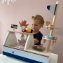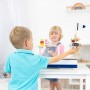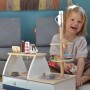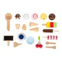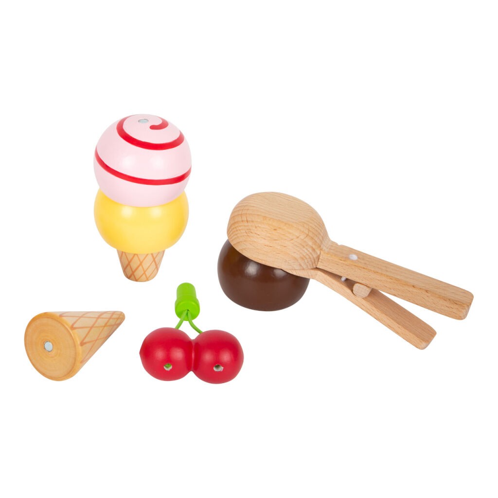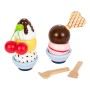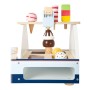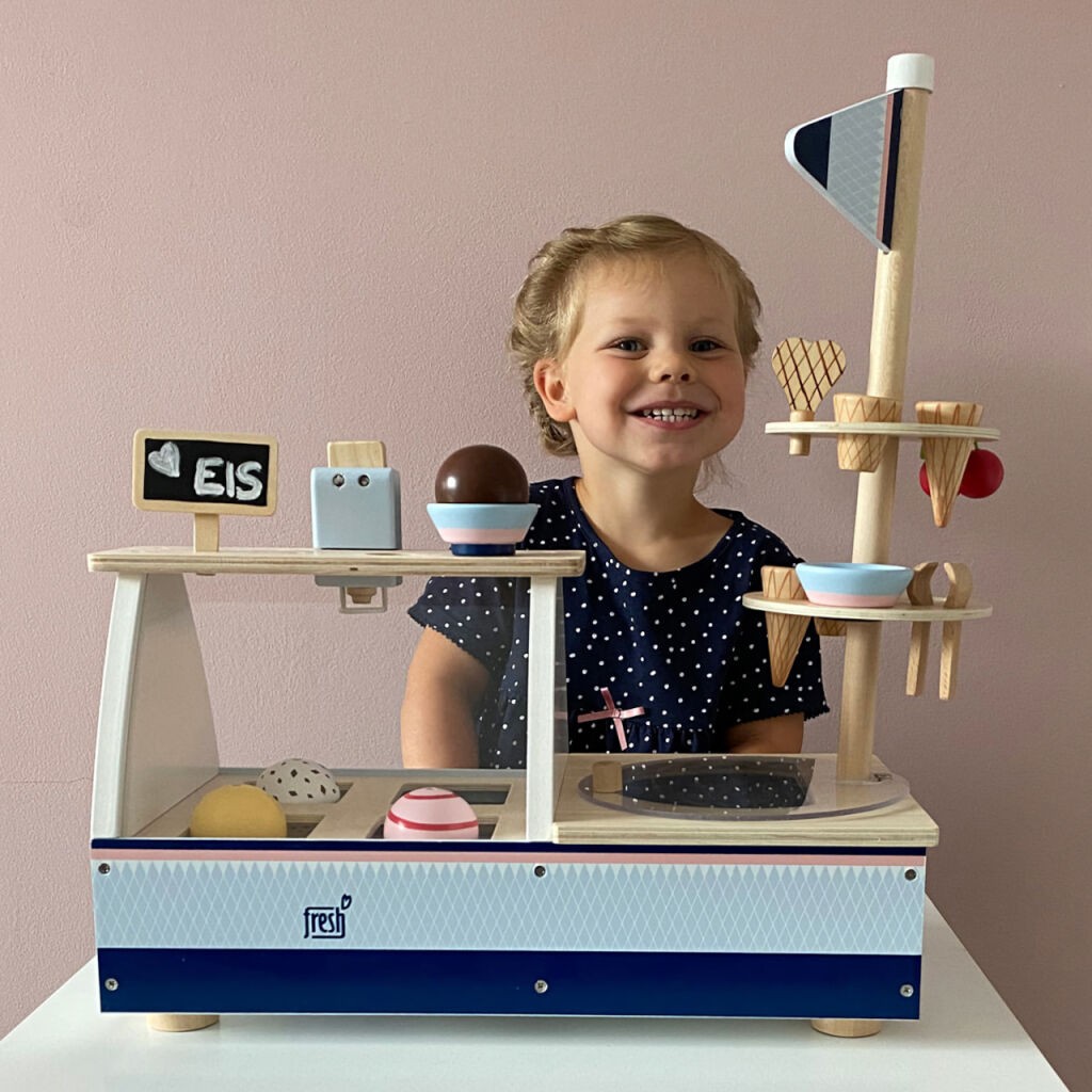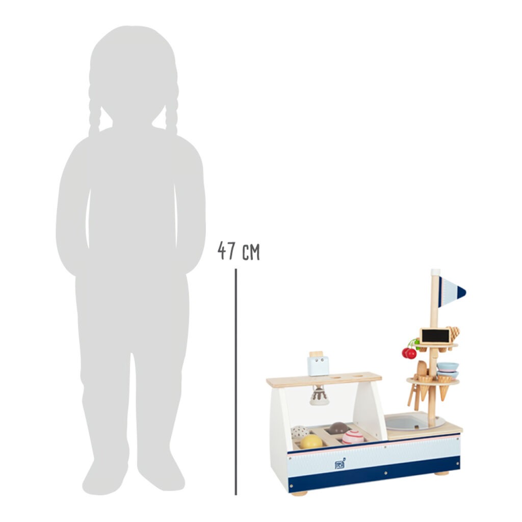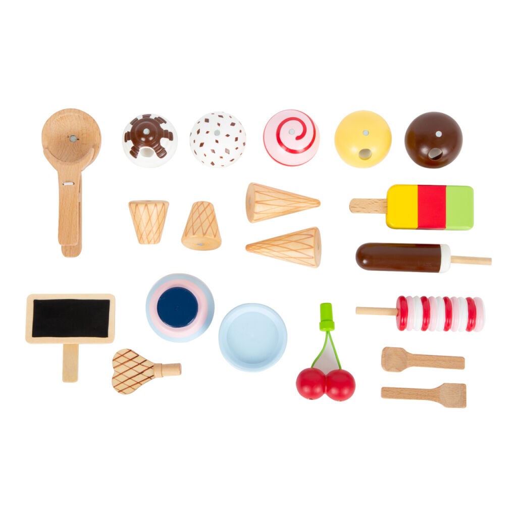 Jdeme na zmrzlinu! Tento dřevěný zmrzlinový set je perfektní na léto i zimu. Zmrzlinový stánek je modro-růžový, má také prvky přírodního dřeva, zákazníky nadchne velkým výběrem dezertů a svými funkcemi a příslušenstvím. Můžete si dát více kopečků zmrzliny, nanuk, točenou zmrzlinu, poháry, wafle... a to vše ozdobit třešničkou. Stánek má také plastovou vitrínu, mrazničku s plastovým poklopem, stojan na kornouty. Kopečky zmrzliny a točená zmrzlina jsou magnetické, v balení také najdete tabulku, na kterou můžete psát křídou. Zmrzlinu (vanilku, čokoládu, stracciatellu a jahodu) můžete z vitríny vyndat a dát ji do misky nebo kornoutu. Všechny se také vejdou na wafli. Vytvořte si dezert dle svého gusta. Zmrzlinový stánek má také úložný prostor. Hlavní vlastnosti Zmrlinové kopečky a točená zmrzlina s magnetyOsm různých příchutí zmrzliny, nanukyKopečky se dají skládat na sebe díky magnetůmVelké a malé zmrzlinové kornouty, misky se lžícemi, wafleStánek s plastovou vitrínou, mraznička s průhledným poklopemGenderově neutrální, jemný design