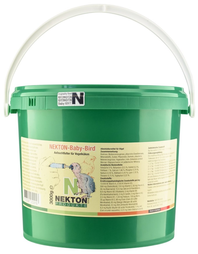 NEKTON-Baby-Bird je vo vode rozpustné kompletné krmivo pre ručný odchov mláďat vtákov. Kombinácia ľahko stráviteľných nutrientov s rastlinnými zložkami zabezpečuje zdravý vývoj obehového systému, kĺbov a orgánov. Pre posilnenie imunitného systému boli použité len vysoko kvalitné prírodné ingrediencie s prídavkom mikronutrientov, podobné prirodzenej potrave. Prebiotiká a probiotiká zaisťujú zdravý rast mikroflóry vo voleti a črevách a podporujú trávenie. Nie je potrebné ponúkať žiadne iné krmivo.