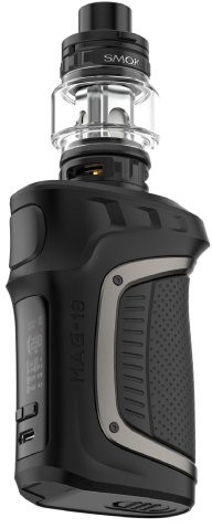 Není určeno pro náplně obsahující nikotin! Smoktech MAG-18 je robustní grip s precizním ergonomickým tvarem, který především ocení milovníci pořádných mraků. Pod tělem baterie, které je vyrobeno ze speciální zinkové slitiny a kůže, se nachází prostor pro dva monočlánky typu 18650. Po zapnutí nás přivítá přehledný 0,96 palcový barevný displej. Mezi tím již MAG-18 aktivoval čip IQ-X, který odpálí výkon až na 230W s rychlým rozžhavením spirály. Mezi jeho další přednosti patří ochrana proti zkratu a přehřátí, historie vapingu, či 8-mi vteřinová ochrana žhavení. Výrobce tento grip osadil clearomizerem TFV18, který zaručuje kvalitní podání chuti, a to díky novým žhavícím hlavám TFV18 Meshed o odporu 0,33ohm a TFV18 Dual Meshed o odporu 0,15ohm. Využívá systém horního plnění - po odsunutí vrchní části plníte liquid otvorem přímo do těla clearomizeru o objemu 7,5ml. Celý clearomizer je plně rozebíratelný = snadná údržba. Regulace přívodu vzduchu pro nastavení optimální kouřivosti se nachází ve spodní části.