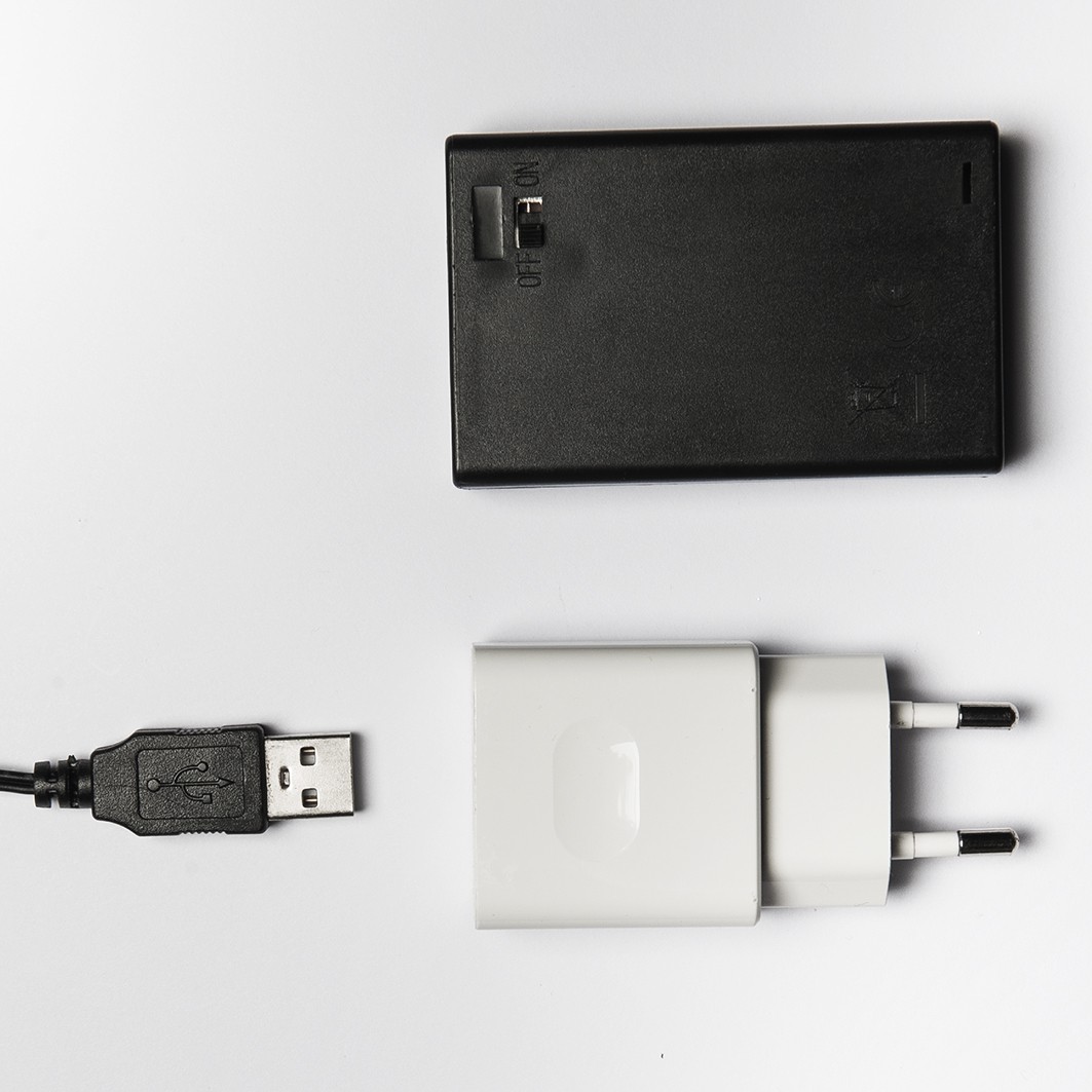 Napájení 3-mi kusy AA 1,5V tužkových baterií nebo přes USB. Nabíječka není součástí balení, každá domácnost dnes vlastní více kusů.