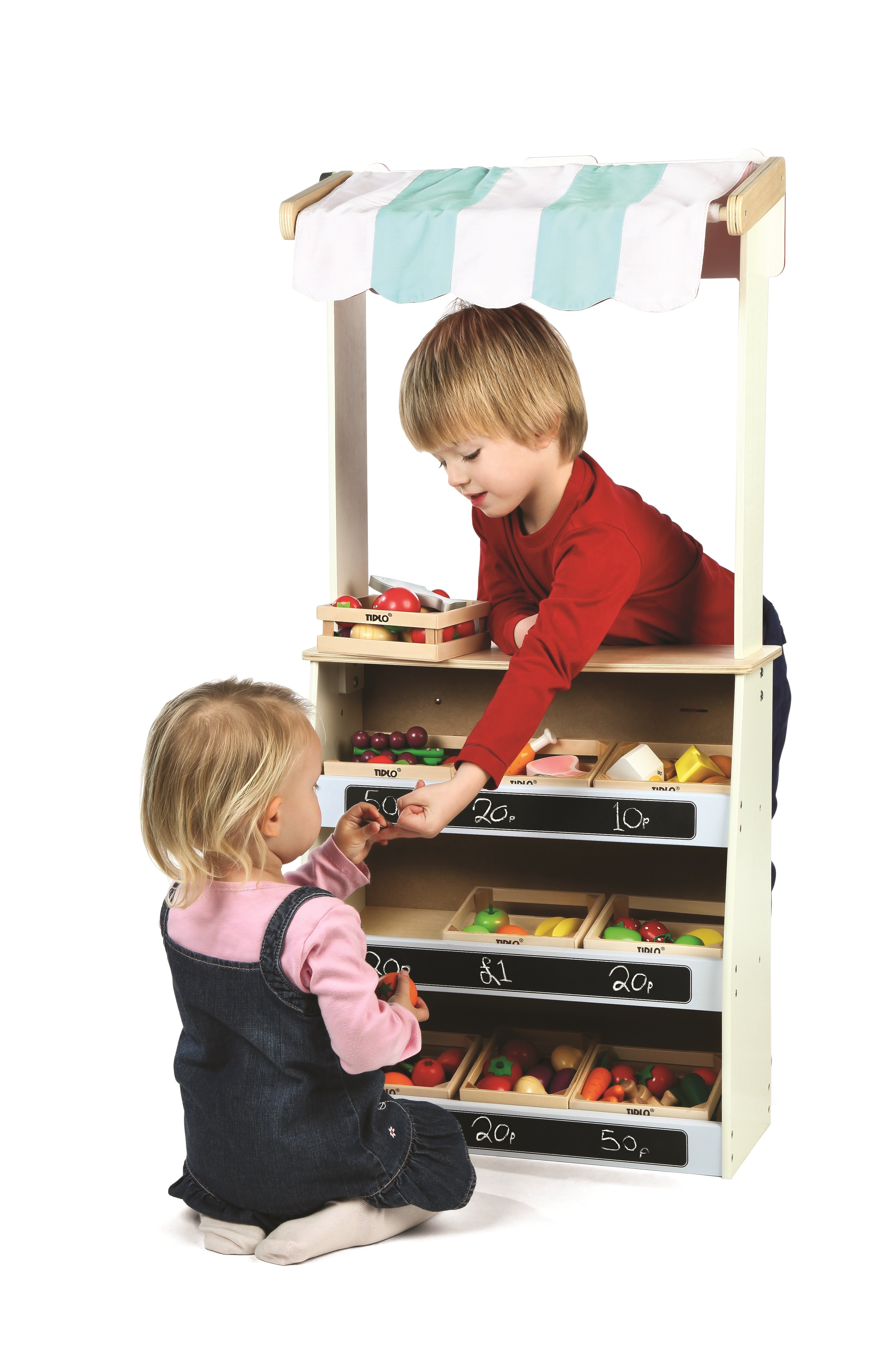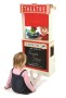 Multifunkční hrací stoleček se stříškou, závěsem, policemi a tabulkami na křídy. Součástí je i malá popisovací tabulka. Bedýnky s potravinami součásti nejsou, lze je dokoupit. Z jedné strany lze stoleček využít jako obchůdek s policemi na uložení potravin - ceny lze pohodlně napsat křídou k naskládanému zboží díky praktickým plochám na popis. Z druhé strany lze stoleček využít jako divadlo. Závěsy se upraví podle potřeby a tabulka umožní zapsat program nebo namalovat plakát. V představivosti se meze nekladou. Vyrobeno z kvalitního dřeva se stabilní konstrukcí. Hlavní vlastnosti: multifunkčnost (hra 2v1)stabilní konstrukce