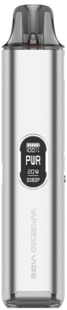 Vaporesso Vibe Pod Kit. Novinka zaujme nejen moderním vzhledem, ale především inovativní technologií Dual Mesh Coil, která přináší plnější chuť liquidu a delší životnost cartridge. Tělo baterie je vyrobeno z lehkého a odolného materiálu, který v sobě ukrývá monočlánek o kapacitě 1100mAh s rychlým USB-C nabíjením (5V/2A) a výkonným čipem AXON. Ten umožňuje přepínání mezi režimy ECO (úsporný výkon) a PWR (plný výkon), přičemž zařízení zároveň umožňuje regulaci airflow a přizpůsobení potahu od utaženého po volný. Na přední straně baterie se nachází praktické spínací tlačítko a barevný 0,54" TFT displej, který informuje o stavu baterie i aktuálním režimu. Vyměnitelná cartridge o objemu 4,5ml je navržena pro maximální výdrž.