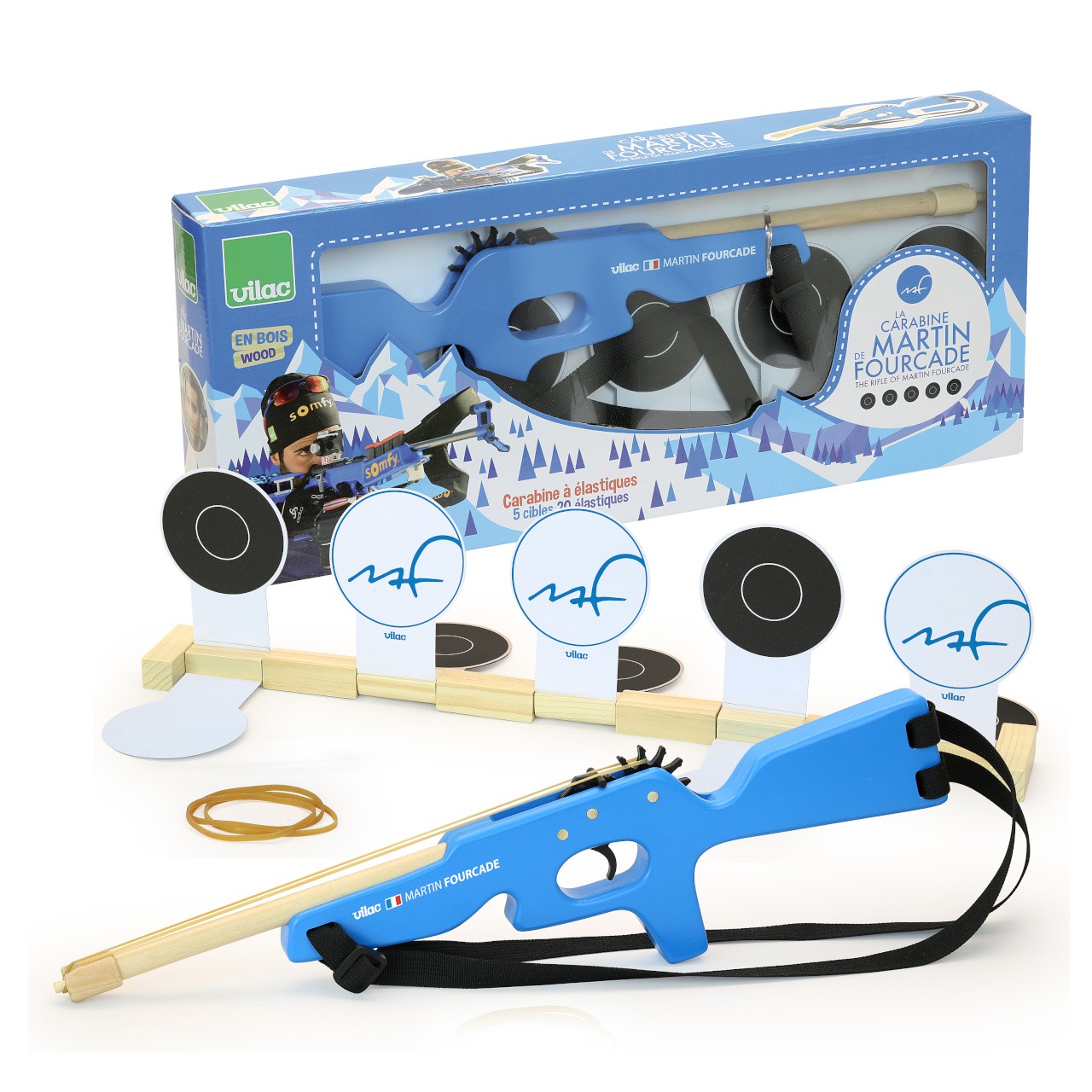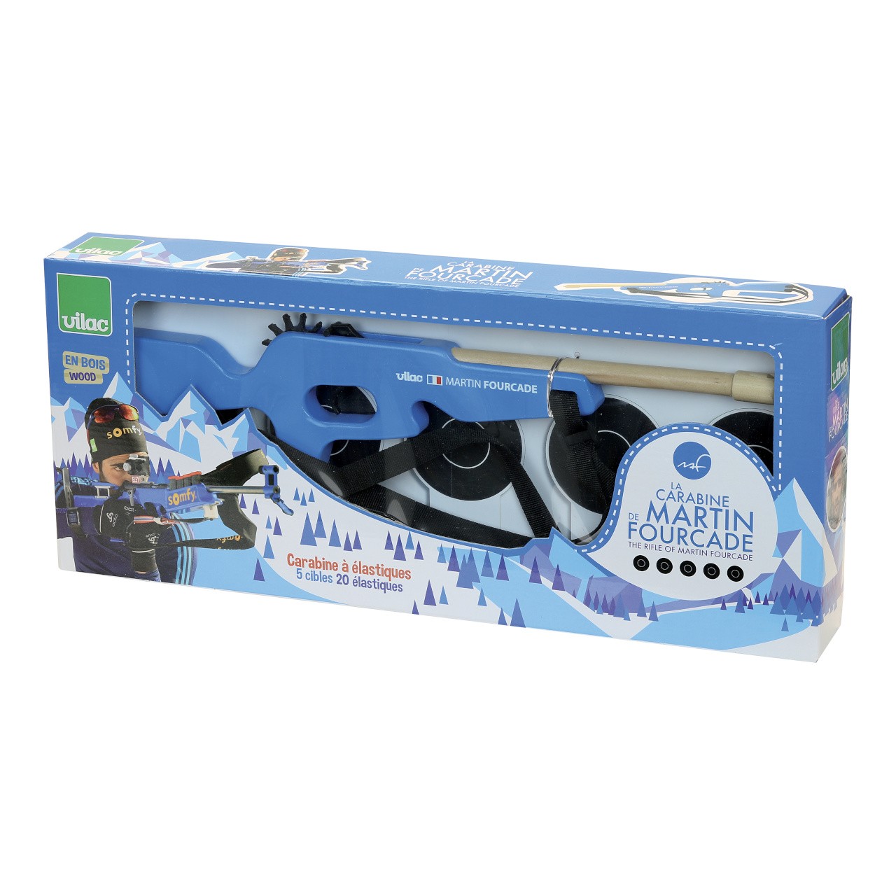 Máte doma malé sportovní nadšence, kteří se nezaleknou ani zimy? Tato hračka je přesně pro ně! Děti se při svých hrách většinou inspirují pohádkami, knížkami nebo televizními programy. Hrají u vás doma v zimním období hlavně sportovní programy? Pak je možné, že máte doma malé biatlonové nadšence. Češi fandí kromě hokeje a lyžování hlavně biatlonu. Představíme vám dnes dřevěnou hračku, která potěší mladé sportovní nadšence. Biatlonová malorážka francouzského sportovce Martina Fourcada. Fourcade je pětinásobný olympijský vítěz a držitel jedenácti zlatých medailí z MS. Pokud sledujete biatlon pravidelně jistě víte, jak je Martin pro svou disciplínu nadšený. Miluje nejen svůj sport, ale i své fanoušky a podporovatele. Je tedy přirozené, že chtěl něco udělat i pro ně – pro vás. Chtěl, aby i ti nejmenší měli možnost naučit se něco o biatlonu a hrát si na sportovce soutěžícího na mistrovství světa či olympiádě. Martin Fourcade se narodil a vyrostl ve Francii, možná i proto se rozhodl oslovit francouzskou firmu Vilac, která se zabývá návrhem a výrobou hraček. V zasněženém pohoří Jura spolu vymysleli projekt, který později nadchnul mnoho dětí a rodičů. Vyrobili Martinovu biatlonovou malorážku. Jako všechny hračky firmy Vilac je i tato malorážka vyrobena s ohledem na životní prostředí. Hračka je vyrobena ze dřeva a má nastavitelné textilní popruhy. Pažba malorážky je modrá, pod hlavní je umístěna vlajka Francie a jména autorů projektu – Martin Fourcade, Vilac. V balení najdete pět sklopných terčů a dvacet gumiček. Nastavte popruhy tak, aby vyhovovaly vašemu synovi, dceři nebo vám samotným. Postavte terče na požadovanou vzdálenost a dejte je do správné polohy. Ukažte dětem, jak správně a bezpečně gumičku natáhnout na dřevěnou malorážku. Teď už stačí jen zamířit a stisknout spoušť! Schválně, na kolik pokusů trefíte všech pět terčů? Hlavní vlastnosti: nastavitelné textilní popruhy v balení pět sklopných terčů a dvacet gumiček