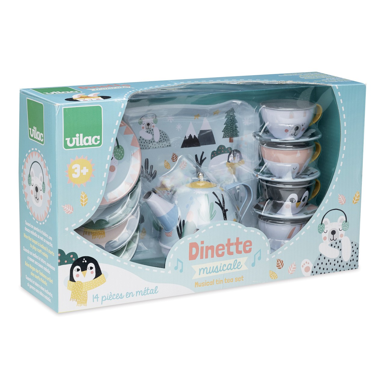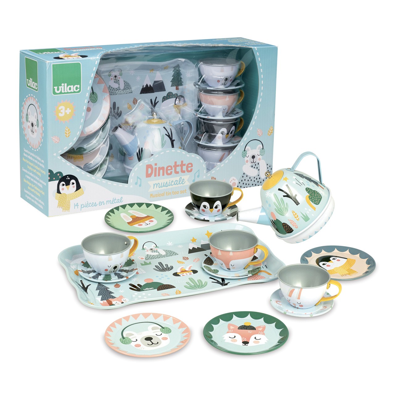 Kovový set nádobí s krásnou zvířecí ilustrací, s podtácem. Tento set je speciální v tom, že při servírování hraje hudbu. V balení najdete 14 ks vybavení: velký tác pro lehký přesun nádobí, 4 hrnečky s podtácky, 4 dezertní talířky a konvičku, která při náklonu začne hrát pěknou melodii. Velikost tak akorát pro dětské ruce. Ilustrováno Michelle Carlslund. Vyrobeno ve Francii. Hlavní vlastnosti: kovová sada nádobí uvnitř konvice na čas je ukryt natahovací hudební strojekdesign Michelle Carlslundobsahuje 14 ks Cestujte s námi v naivním a elegantním světě dánské ilustrátorky Michelle Carlslund, světě jemných barev, který je plný roztomilých medvědů a přátelských ptáčků. V roce 2010, když Michelle ještě studovala grafický design, vytiskla doma své ilustrace a zkusila je prodat na designovém trhu, kde se setkaly s velkým úspěchem! Několik obchůdků chtělo začít prodávat její výtvory, a tak ji napadlo, že by bylo fajn začít podnikat. Michelle se rychle stala uznávanou nezávislou ilustrátorkou. Dnes lze její ekologická grafická díla zakoupit po celém světě v designových buticích, papírnictvích a dětských obchodech. Michelle se inspiruje vším kolem ní. Její výtvory jsou něžné a poetické, stylizovaný a dětinský styl, který se perfektně prolíná s hračkami firmy Vilac. „Jsem hranolky milující, časová optimistka a tvůrkyně ekologických plakátů a ilustrátorka na volné noze se sídlem v dánské Kodani,“ to by řekla ilustrátorka Michelle Carlslundová, kdyby se měla popsat jednou větou.