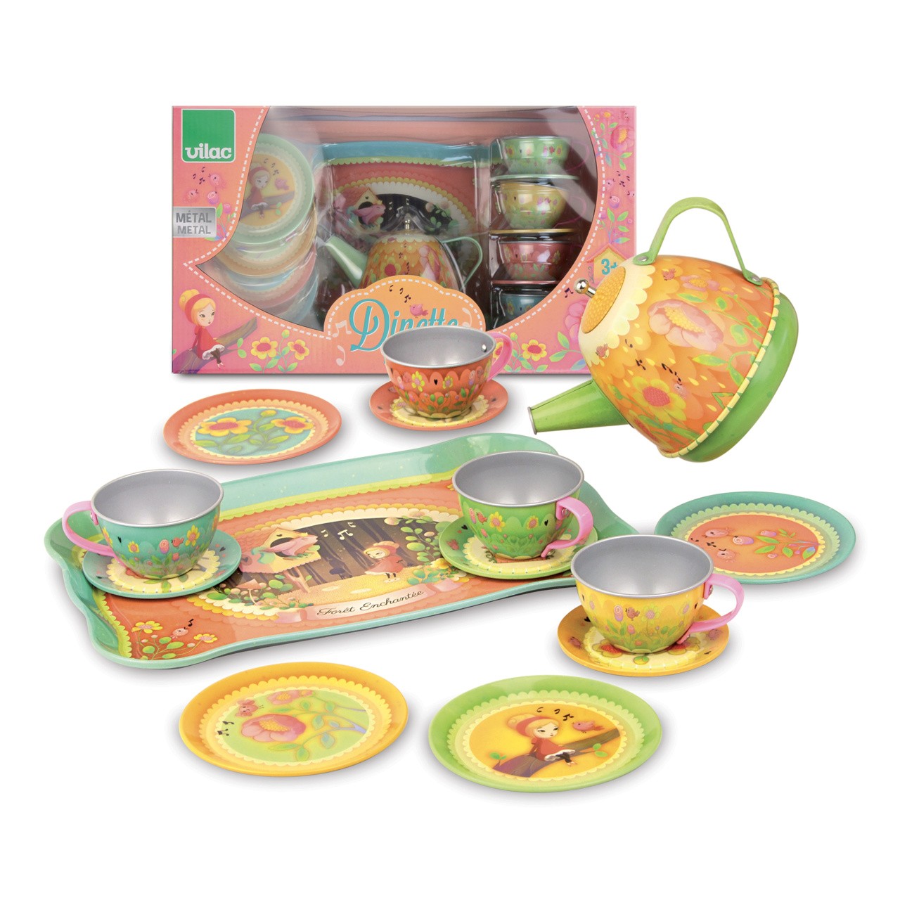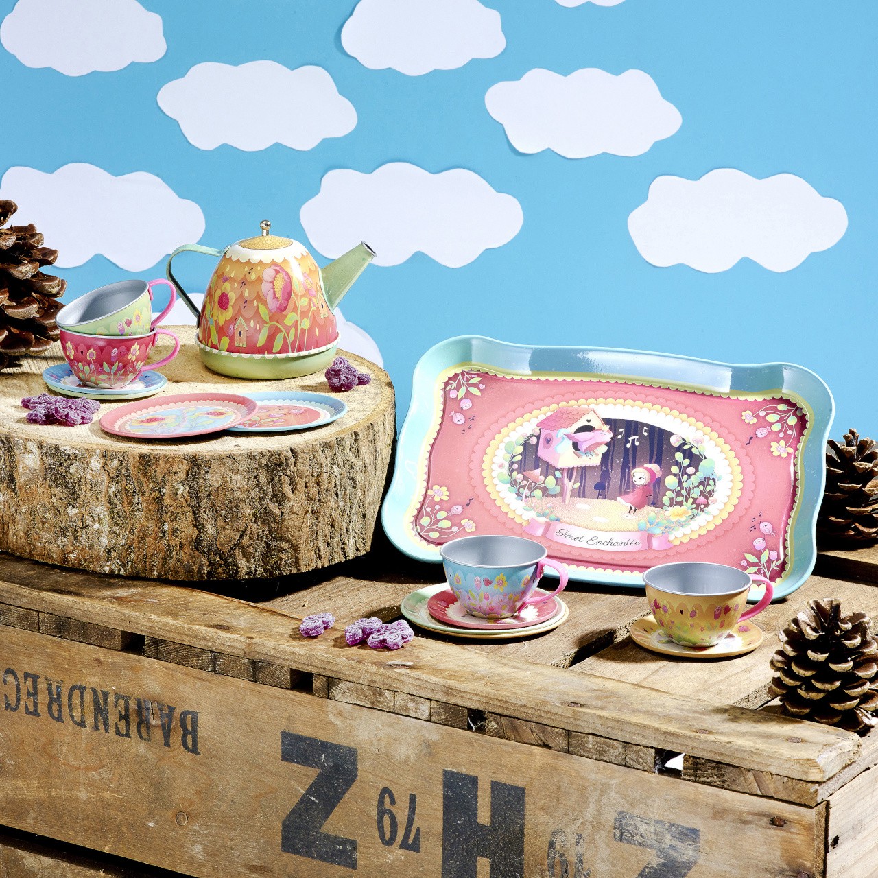 Kovový set nádobí s krásnou pohádkovou ilustrací „magického lesu“, s podtáckem. Tento set je speciální v tom, že při servírování hraje hudbu. V balení najdete 14 ks vybavení: velký tác pro lehký přesun nádobí, 4 hrnečky s podtácky, 4 dezertní talířky a konvičku, která při náklonu začne hrát pěknou melodii. Velikost tak akorát pro dětské ruce. Vyrobeno ve Francii. Hlavní vlastnosti: obsahuje 14 kskovové nádobíkonvice v sobě ukrývá natahovací hrací strojekvyrobeno ve Francii