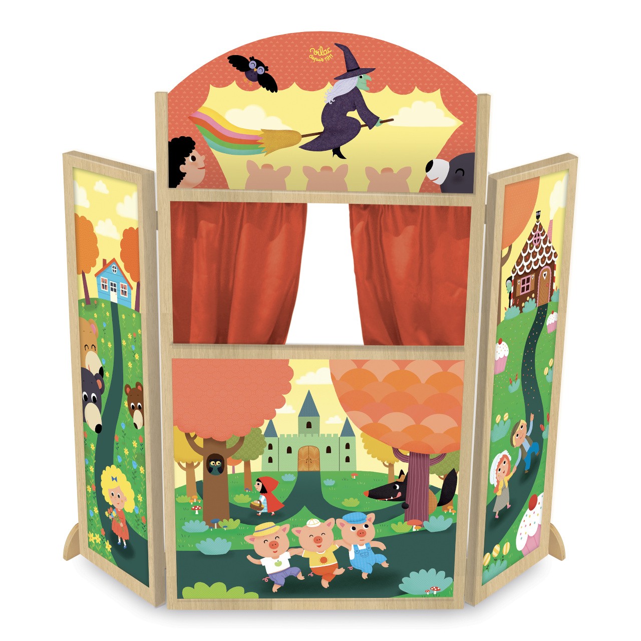 Velkolepé trojstěnné divadlo s motivem hrdinů oblíbených pohádek. Na prostřední stěně má divadlo ve vrchní části okno s oponou. Děti si mohou vymyslet vlastní příběh a zabavit své kamarády či rodinu.  Hlavní vlastnosti: třístěnné dřevěné divadlo s 2 skládacími křídly a oponourozvíjí kreativitu, řeč a přestavivost dětí