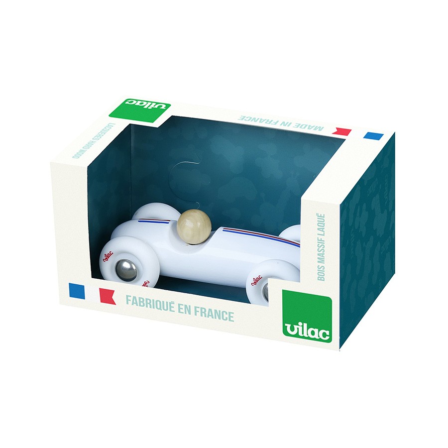 Model bílého vintage auta ze závodu Grand Prix. Vyrobeno z lakovaného dřeva ve Francii. Má velká bílá gumová kola, která zajišťují tichý chod na všech podlahách.  Hlavní vlastnosti: vyrobeno ve Francii