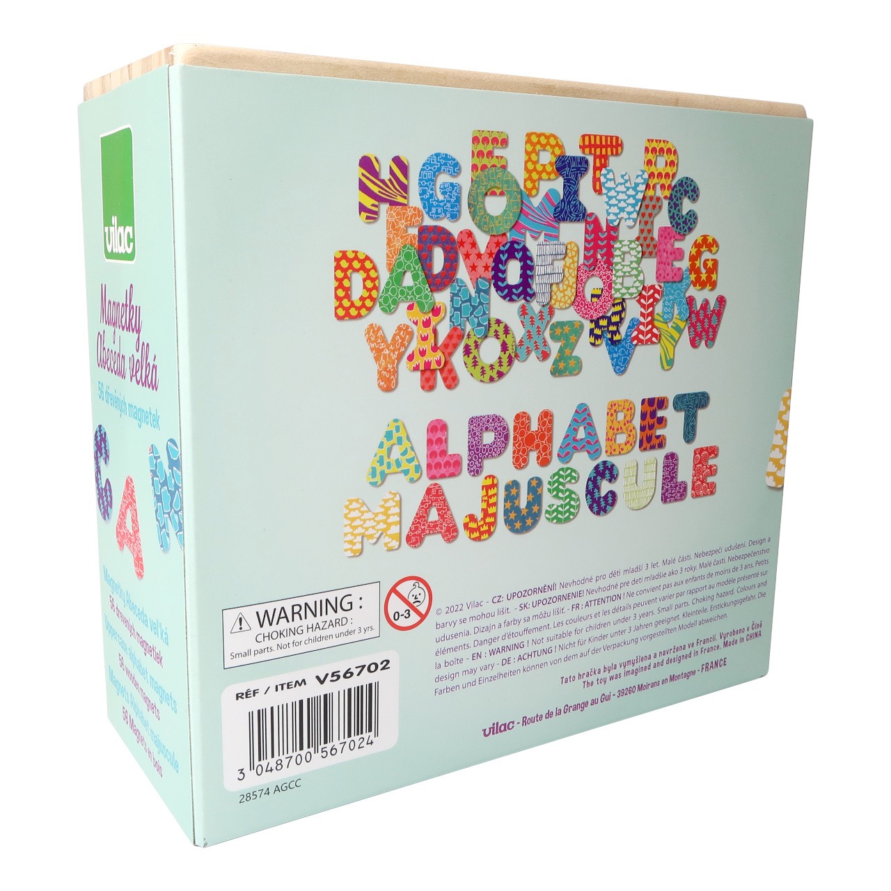 Magnetická, dřevěná písmena abecedy mohou děti naučit jejich první slova. Je možno si s nimi hrát na lednici nebo magnetické tabulce. Jsou zdobena pestrou paletou poutavých barev a jedinečných vzorů. Každé písmeno je tak ještě snadněji rozpoznatelné a motivuje k vytváření stále nových spojení. Hlavní vlastnosti:56 ks magnetekjasné, výrazné barvy a nápadité vzoryvhodné jako dekorační prvek i didaktická pomůcka