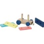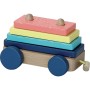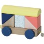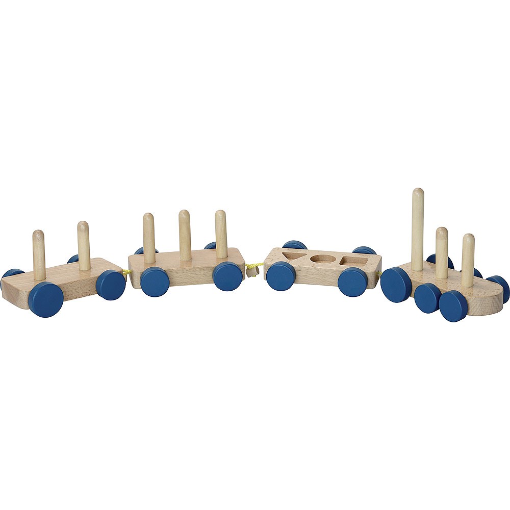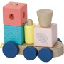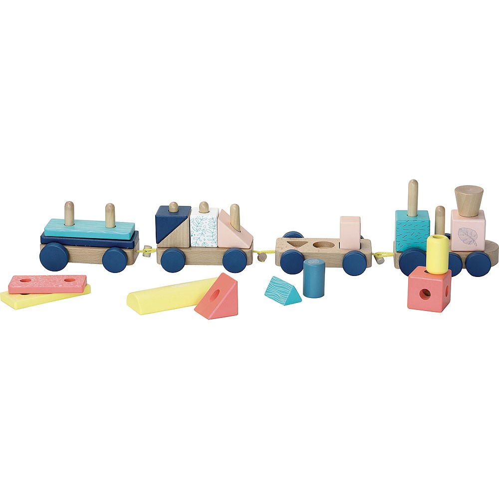 Dřevěná multifunkční hračka, vláček, na který můžete skládat kostky. Kostky mají různé velikosti, tvary a barvy. Mašinka a vagónky jsou spojeny textilními poutky s dřevěnou kuličkou. Vláček je pojízdný. Vhodné od 18 měsíců. Hlavní vlastnosti: multifunkční hračkaobsahuje 22 dílů