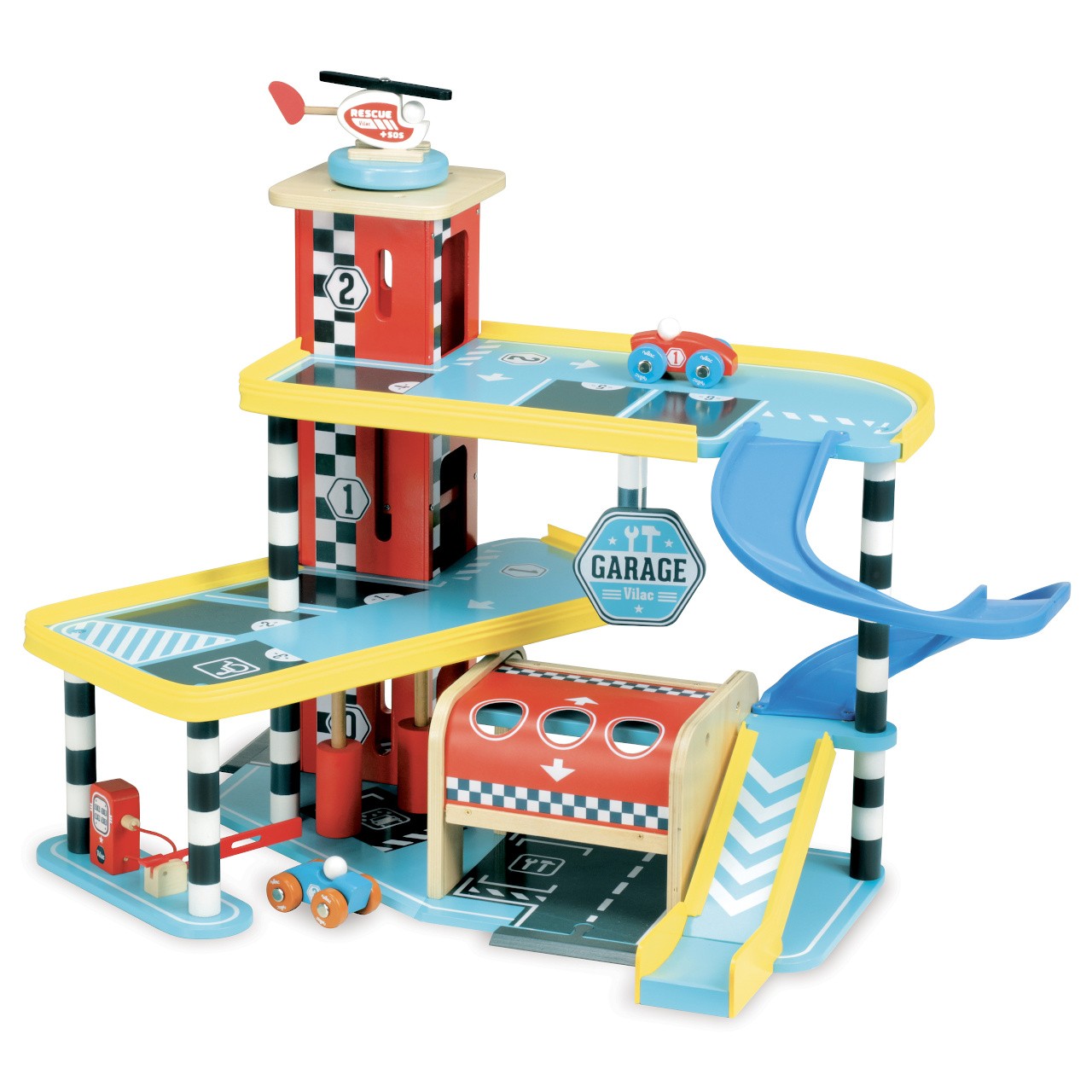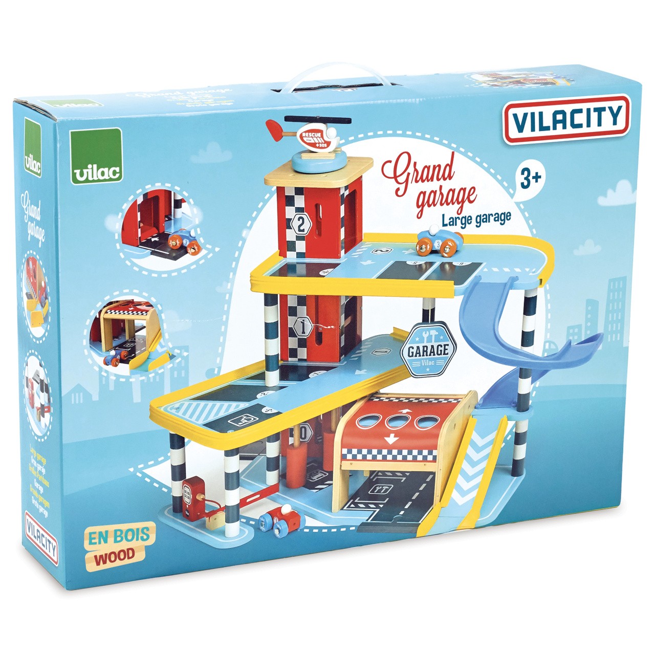 Velká garáž s rampou, která nabízí množství mechanických detailů, zejména výtah, zatahovací dveře, parkovací závoru, ale i čerpací stojan, či mycí kartáče. Její součástí je také dvojice autíček a helikoptéra. Garáž je součástí Vilacity kolekce a je se všemi jejími součástmi plně kompatibilní, další samostatná rozšíření přinesou variabilitu a prohloubí zážitek ze hry. Výrobek vyžaduje montáž, dodáváno s detailním návodem k sestavení.   Hlavní vlastnosti:garáž, 2 autíčka a helikoptéravýtah, zatahovací dveře, závora, čerpací stojan a mycí kartáčekompatibilní se všemi součástmi Vilac Vilacity kolekcevyrobeno ekologicky, šetrně k prostředí   V2354 – Velký závod Vilacity (není součástí sady, najdete v naší nabídce):     Příklad sestavy garáže s dalšími součástmi kolekce Vilacity: