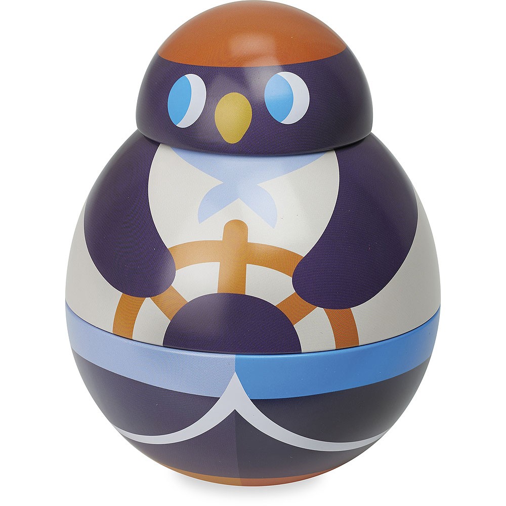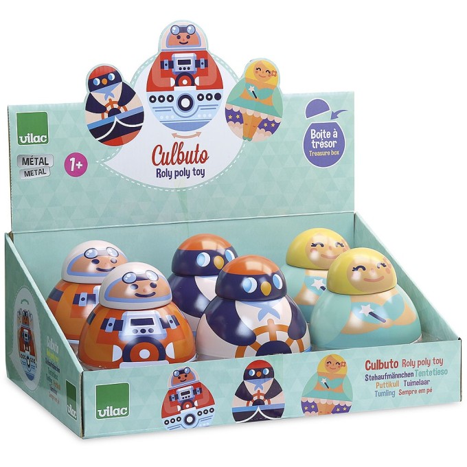 Vtipná kovová dóza s ilustrací postavičky víly, tučňáka a závodníka, do které si děti mohou uložit své poklady. Zároveň se díky svému tvaru kývá ze strany na stranu. Hračky Vilac mají značku francouzské agentury ADEME, to znamená, že tyto dřevěné hračky jsou vyráběny ekologicky. Šetří životní prostředí, neznečišťují půdu, vodu a vzduch, neplýtvají energiemi.