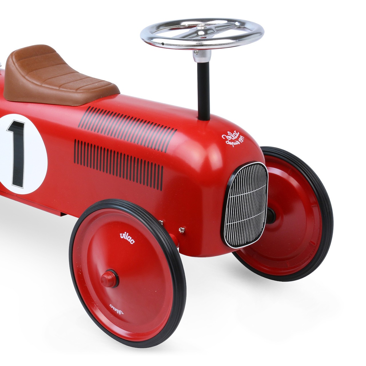 Odrážedlo Vintage ve stylu závodního auta je plně kovové a má červenou metalickou barvu. Volant ovládá zatáčení předních kol. Hnědé sedadlo je vyrobeno z plastu. Kola odrážedla jsou pogumovaná a zaručují tak tichý chod i na pevném povrchu. Hlavní vlastnosti: stabilní kovové odrážedlo s pogumovanými kolystylový originální designnosnost 20 kg