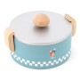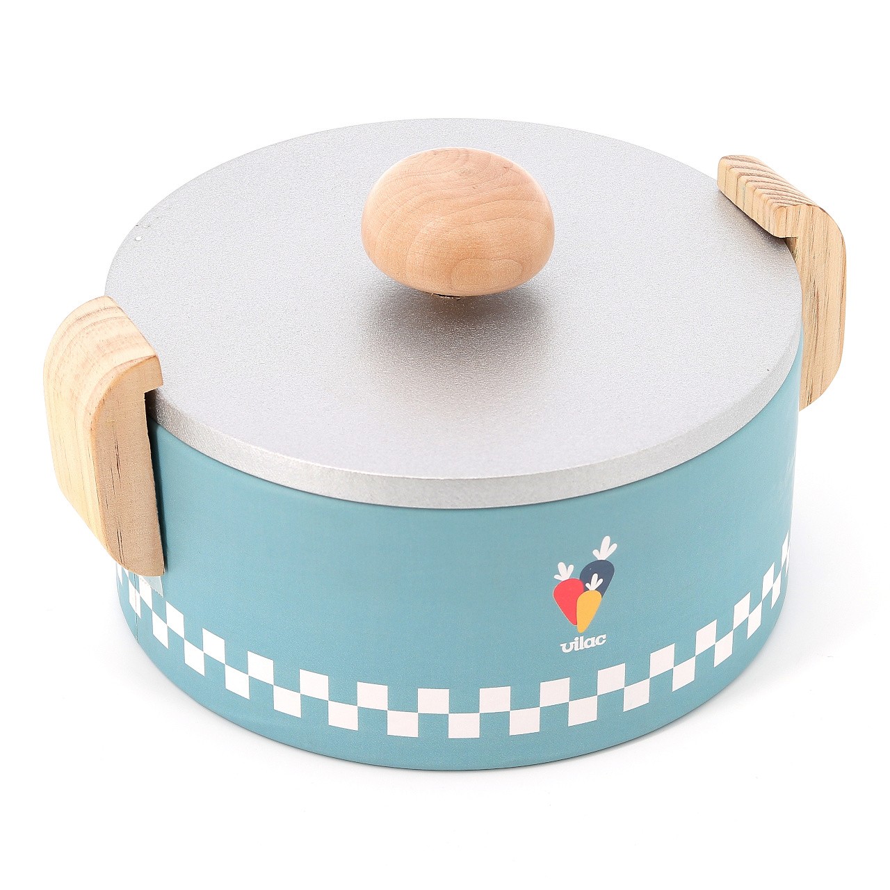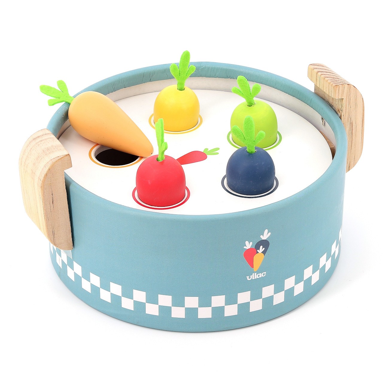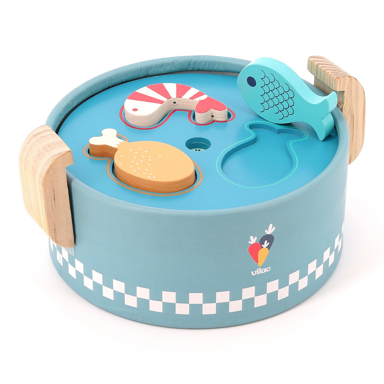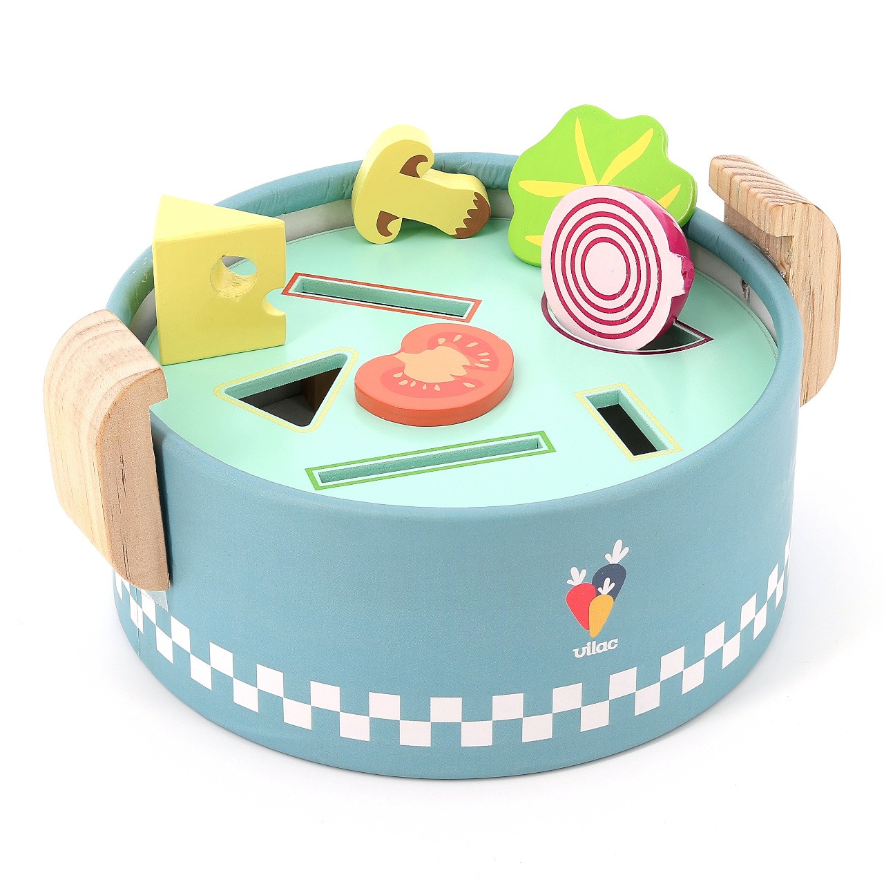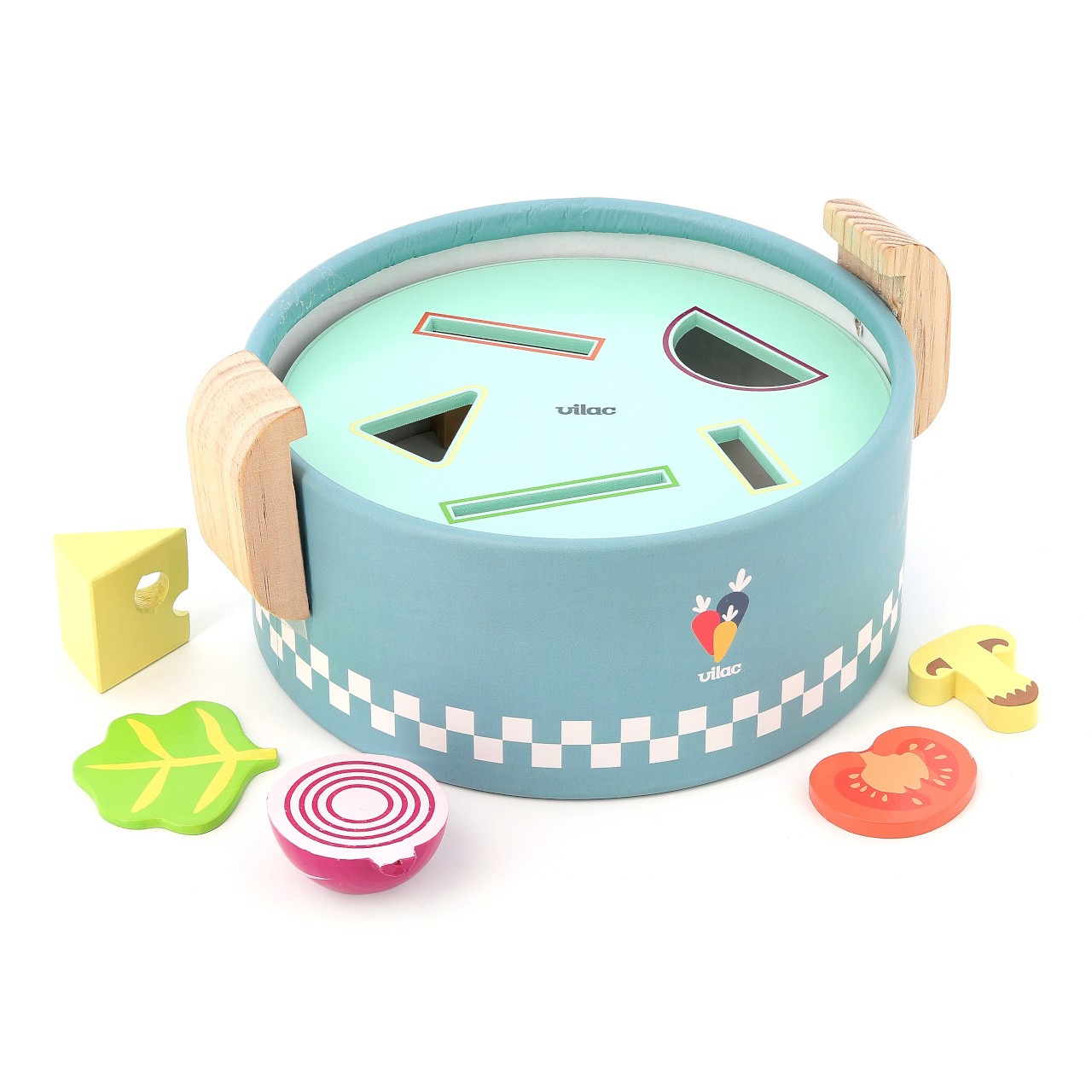 Co bude dnes k obědu? To je překvapení, které ukrývá důvtipná vkládačka v podobě malého hrnce. Pod jeho víkem naleznete tři výměnné desky s mnoha různými otvory, do nichž lze vkládat, nebo jimi vhazovat rozmanité pestrobarevné ingredience. Děti tak mohou zábavným způsobem cvičit rozpoznávání tvarů i barev a zdokonalovat svou motoriku. Díky praktickému balení lze všechny součásti snadno uklidit a uložit. Hračka kombinuje díly z odolného kartónu a pečlivě opracovaného dřeva.   Hlavní vlastnosti:hrnec s víkem, 3 děrované desky a 13 dílků ke vkládáníjedinečný design a zpracovánípraktické balení