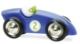 Modré závodní auto speciálního designu, vyrobeno z lakovaného dřeva s kovovými pogumovanými koly. Je vhodné jak ke hraní tak jako dekorace do pokojů dětí či dospělých. Vyrobeno ve Francii.  Hlavní vlastnosti: vyrobeno ve Francii