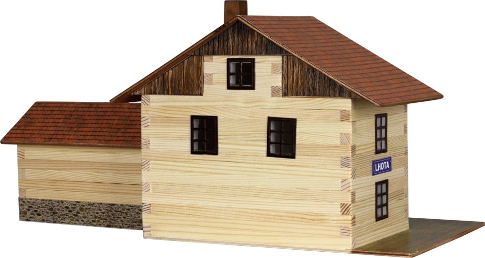 Dřevěná slepovací stavebnice obsahuje dřevěné hranolky daných délek ke stavbě roubených stěn, díly na střechy a štíty, kartonové výseky oken a dveří i předtištěné papírové potisky. Součástí stavebnice je schematický montážní plán. Meřítko 1:45. Ve stavebnicích HOBBY KITS naleznete vše potřebné k sestavení. Ke stavbě slouží jednoduché obrázkové návody se symboly jednotlivých úkonů, a proto je můžou sestavovat děti po celém světě. Základním stavebním materiálem jsou přesně zhotovené hranoly z borového dřeva a rozměru 9×9 mm v délkách od 16 do 230 mm určených ke stavbě roubených stěn. Plochy střech, štítů, pavlačí a teras jsou zhotoveny z překližky 3 mm a polepují se papírovými potisky. Funkční dveře a okna zasklená folií jsou z potisklého kartonu. Jednotlivé stavby se slepují lepidlem na dřevo a papír (není obsahem). Součástí návodu jsou malé kapitoly ze stavebního oboru a historie lidové architektury. Model nádraží je v měřítku 1:45.Hotové stavby jsou estetickými doplňky dětských pokojíčků, využívají se ke hrám s autíčky, zvířátky, vojáčky i panenkami, o vánocích mohou tvořit základ lidového Betlému. Hlavní vlastnosti: 213 dílů celkemměřítko: 1:45precizní a pečlivé zpracováníz odolného borového dřevavyrobeno v České republice Ukázka stavby a velikosti dílů, video je pouze ilustrační. Dokumentace: návod ke stavbě Označení „Správná hračka“ je udělováno produktům, které cílí na děti předškolního věku a vynikají zejména výchovnými kvalitami, ale i vysokým standardem zpracování, komfortem používání a estetickou úrovní. Záměrem tvůrců ocenění je poskytovat vodítko a oslovovat rodiče i pedagogy, kteří chtějí ovlivňovat směřování nabídky a za prvořadý považují zdravý osobnostní rozvoj dětí. Tím chtějí tvůrci podněcovat k rozšiřování a vývoji nových hodnotných hraček či her. Označení je udělováno od roku 1994 a je společným projektem Sdružení pro hračku a hru, Asociace hračka Unie výtvarných umělců ČR a Asociace předškolní výchovy. Tato sdružení společně s Uměleckoprůmyslovým muzeem v Praze a Městským muzeem v Kamenici nad Lipou udělují ocenění při příležitosti festivalu Hračkobraní konajícího se každoročně od roku 2006 na zámku v Kamenici nad Lipou, kde můžete mimo jiné zhlédnout stálou expozici všech oceněných hraček.