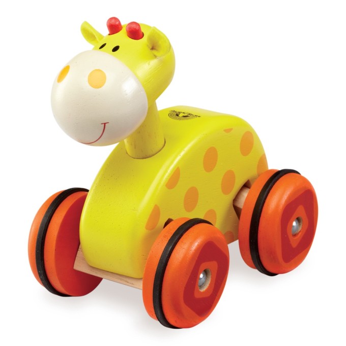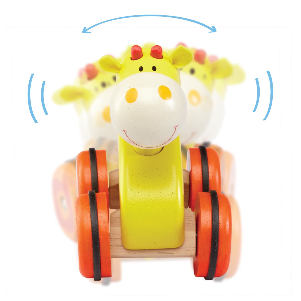 Prožeňte veselou žirafu na kolečkách. Naklápěním vozítka se natáčí jeho kolečka a určuje se tím směr jízdy. Kolečka jsou vybavena gumovými kroužky, které zajišťují klutivovaný a tichý chod na všech druzích povrchů. Pestrými barvami snadno zaujme a jejím prostřednictvím děti mohou rozvíjet koordinaci pohybů a motoriku. Hlavní vlastnosti:naklápěním zatáčíkultivovaný, tichý chododolné provedení z masivního dřevapříjemné oblé tvary stimulující hmatvytříbená barevnost a povrchová úprava